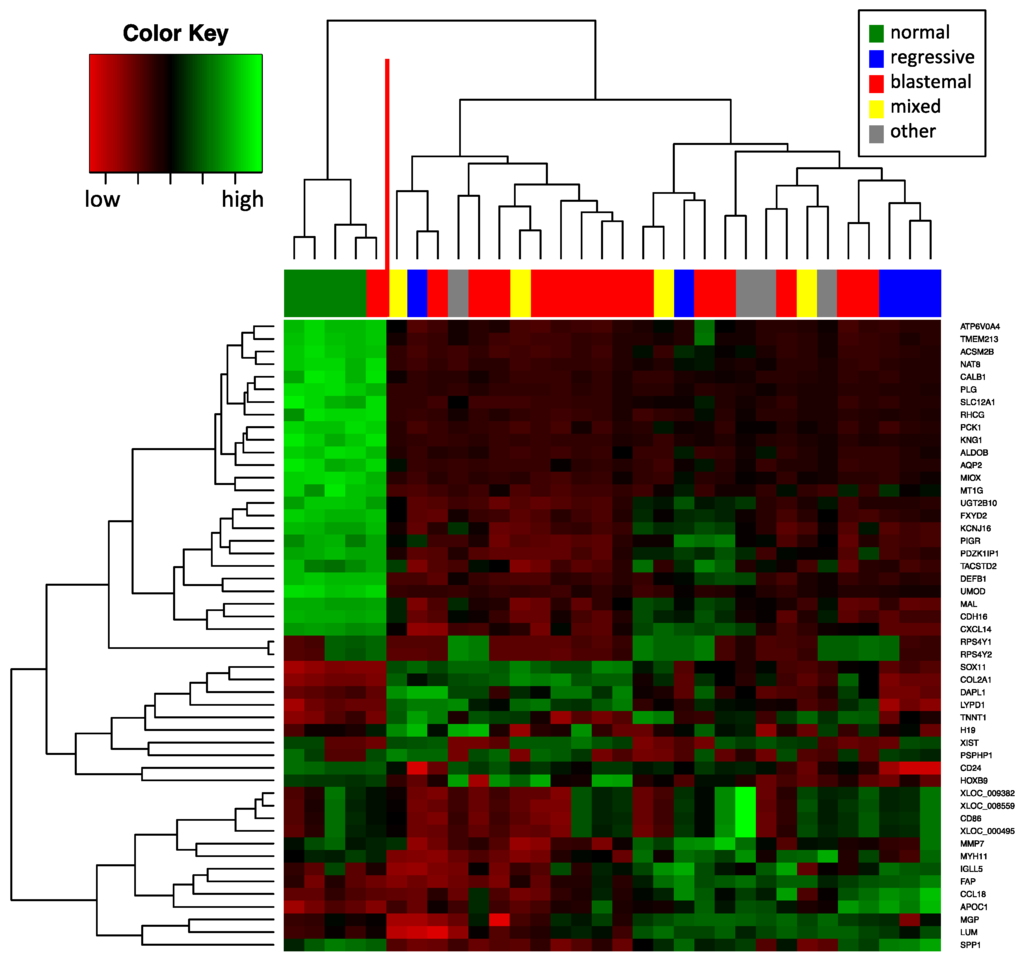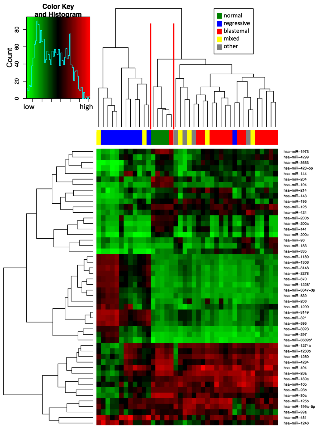 We measured the expression of 1205 miRNAs by using Agilent microarrays based on miRBase version 16. Following background correction and quantile normalization, the miRNA expression profiles of 36 WTs and four normal kidney samples were used to identify miRNAs differentially expressed between the main WT subtypes, including regressive WT, mixed WT, and blastemal WT, and normal kidney samples. Unsupervised hierarchical clustering using the miRNAs with highest variance in our set revealed three main groups (Figure 1). One cluster contained 10 of the 11 regressive WT and two samples of mixed WT subtype, the second contained all four normal kidney samples and one blastemal WT, and the third contained the remaining 14 blastemal WTs, four mixed WTs, one regressive WT and four samples with other subtypes (stromal, epithelial, diffuse and focal anaplasia, one sample each). The one blastemal tumor sample that clusters together with the normal kidneys may have had a low percentage of tumor cells, therefore the miRNA profile might be masked by more abundant normal cells in the sample. In general, this analysis shows that tissue-borne miRNAs allow classification not only between normal kidneys and the WT, but also between regressive and blastemal WTs.