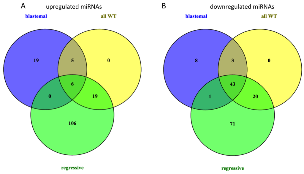 Venn diagram of (A) up- and (B) down-regulated miRNAs in Wilms tumors (WT) compared to normal kidneys.