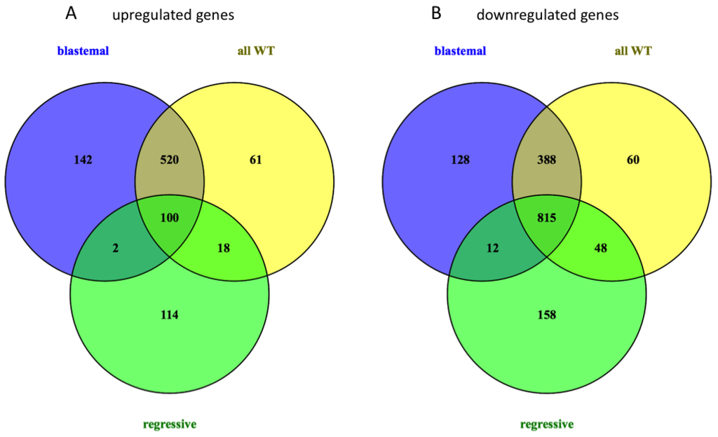 Venn diagram of (A) up- and (B) downregulated genes in Wilms tumor compared to normal kidneys.