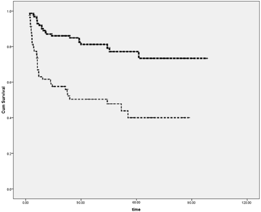 Kaplan Meyer Survival curve according to endomyocardial biopsies (EMB) (virus positive EMB in thick dashed line and virus-negative EMB in thin dashed line) (p < 0.001, see text for explanation).