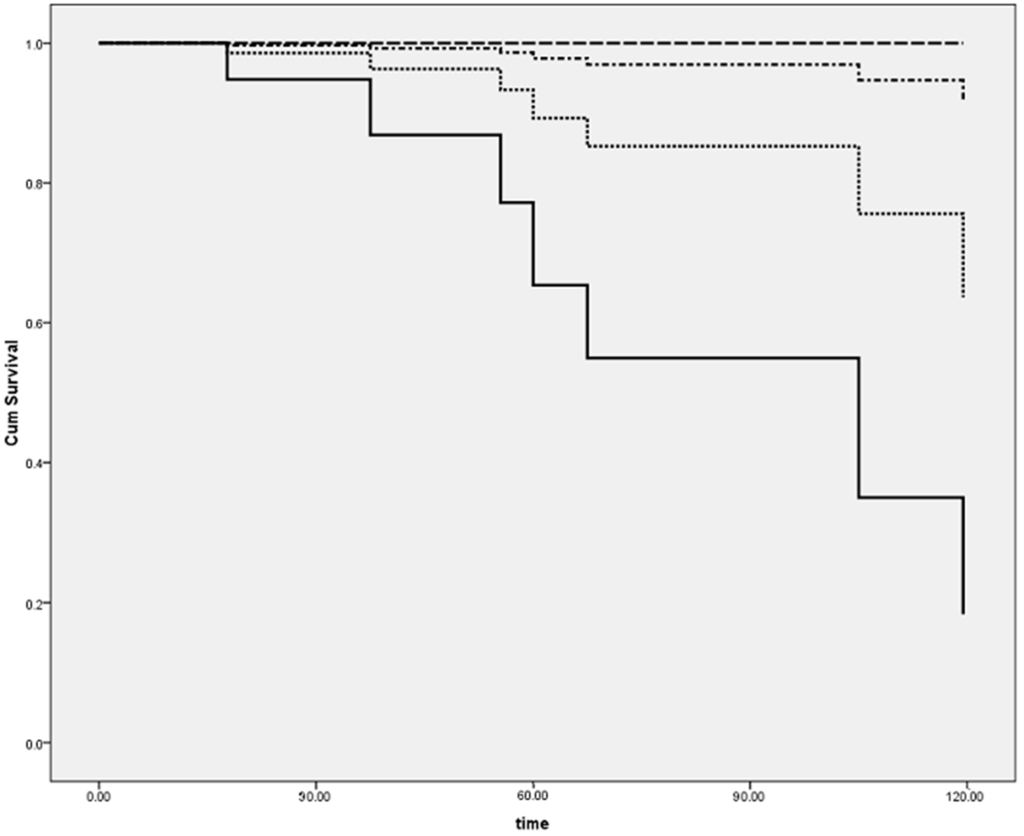 Analysis performed by separating groups according to the diagnosis (dilated cardiomyopathy (DCM) vs. myocarditis) and presence of a positive EMB. Consequently, four subgroups were created: DCM-negative polymerase chain reaction (PCR) (continuous line), DCM-positive PCR (dotted line), myocarditis (MYO)-negative PCR (dotted-dashed line), and MYO-positive PCR (dashed line). See text for explanation.