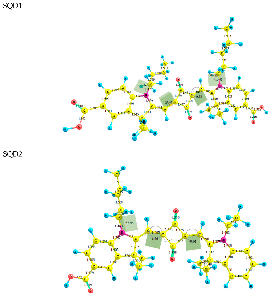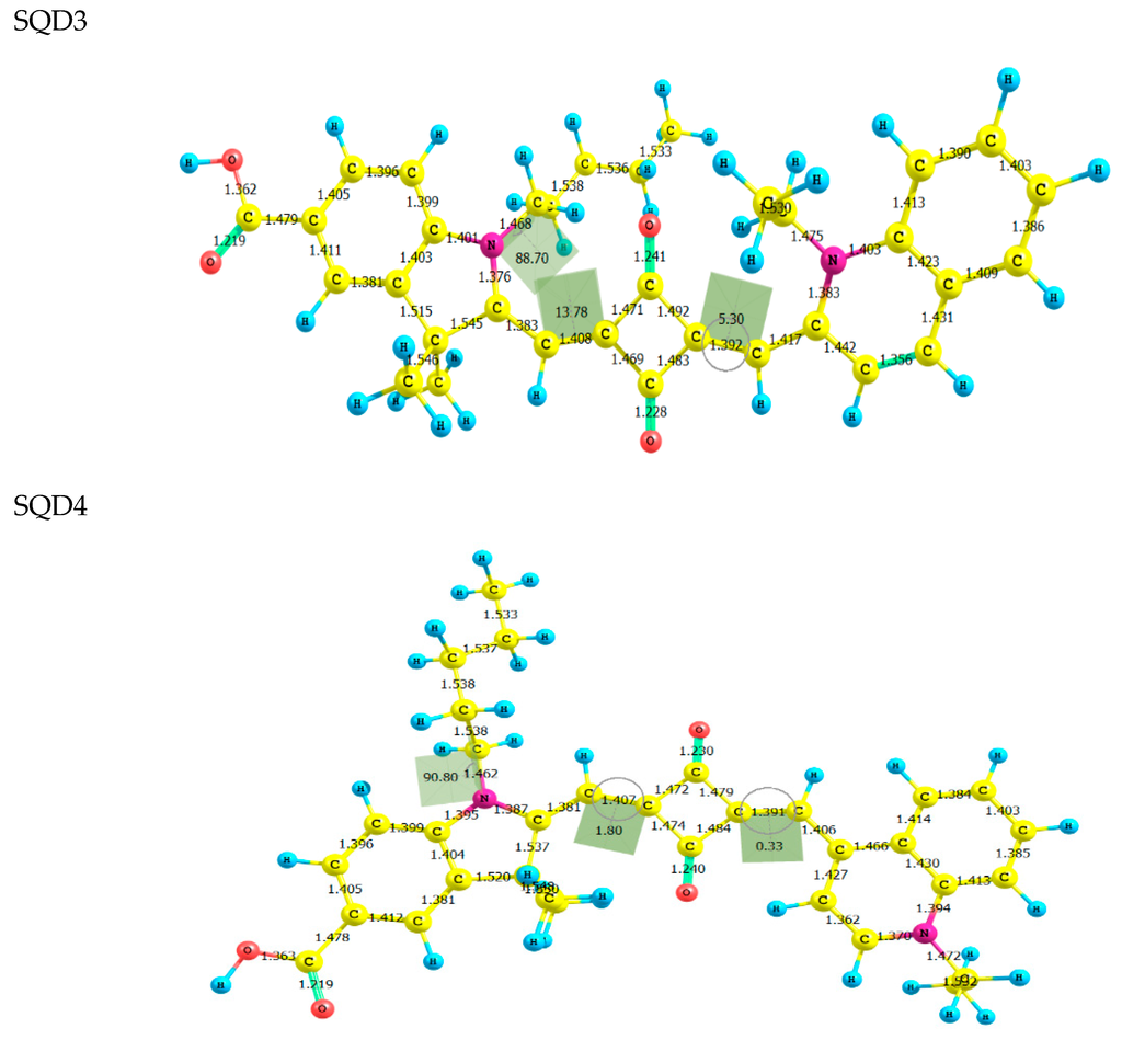 Optimized geometries and selected bond lengths (Å) and dihedral angles (°) of dyes SQD1-SQD4 using B3LYP/6-311++G** level of theory. Green color and rings indicate dihedral angles.