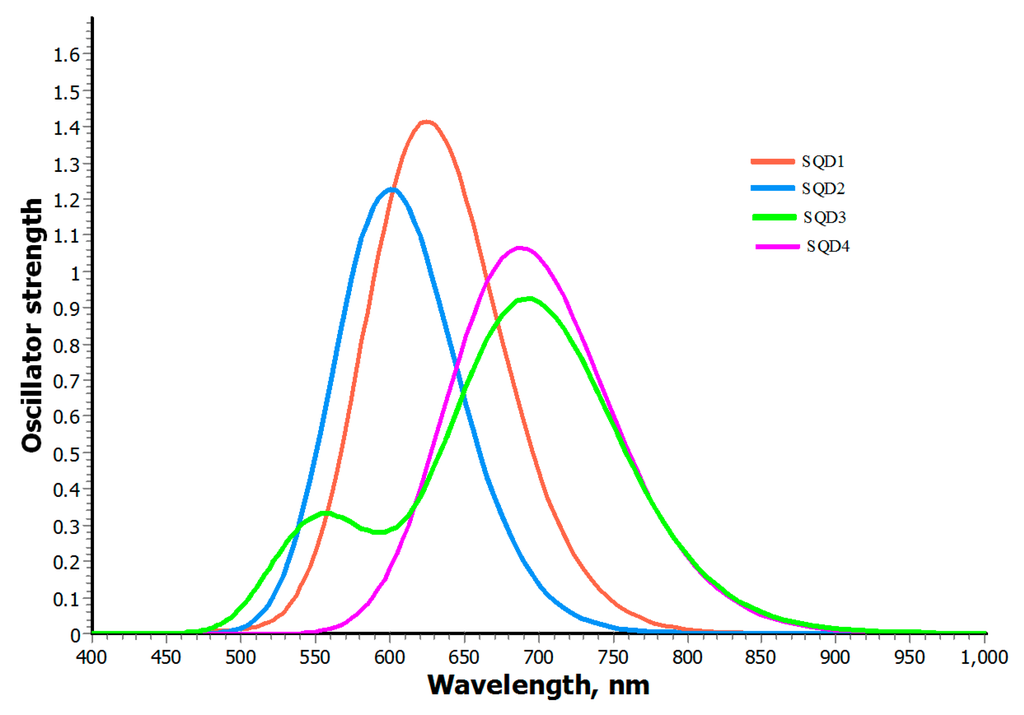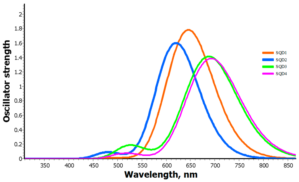 The UV-visible absorption spectra of SQD1–SQD4 dyes calculated using PBE/6-311++G** level of theory in methanol.