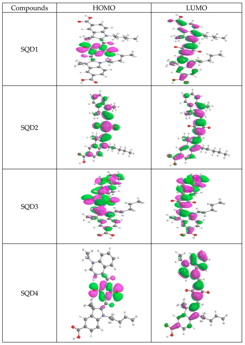 For all dyes, the λmax is assigned to be mainly due to a HOMO→LUMO transition, whereas the second weak absorption corresponds to HOMO-LUMO + 1 or HOMO-1→LUMO transitions. These results in Table 2 show that all studied dyes share an intense π→π* absorption, where the electron density is mainly transferred from the HOMO to the LUMO (> 65%). Table 1 presents the electronic energy levels and gap energy using PBE/6-311++G** level of theory. The HOMO and LUMO energies of SQD1, SQD2, SQD3 and SQD4 are −4.68, −4.50, −4.47, −4.29 and −3.41, −3.19, −3.38, −3.22 eV, respectively. These values indicate that the HOMO energy in dye SQD4 is highest one due to the presence of the para-quinoline group. The ELUMO values for all dyes are located above the conduction band edge of TiO2 (−4.26 eV) [27]. The relative matching of electronic levels of sensitizers would lead to energetically favorable electron injection as well as regeneration of oxidized dye during DSSC operation. Figure 4 shows the calculated electronic energies of frontier orbitals and corresponding surface density plots. The natural transition orbitals (NTO) of the studied dyes are presented in Figure 4. As demonstrated in Figure 4, the electron distributions of the HOMO orbitals of the dyes were mostly localized over the squaric ring, whereas those of the LUMO orbitals were mainly localized in the indoline and its attached carboxylic group. Furthermore, the results indicated that the HOMO–LUMO excitation induced by light irradiation can effectively move the electron distribution from the squaric-indoline moiety to the carboxylic anchoring group leading to an electron injection if the carboxyl group is attached to TiO2 semiconductor. The decrease in the HOMO–LUMO gap could be attributed to the increase in π-electron density of the molecule, which leads to an increase in diradical character and bathochromic shift.