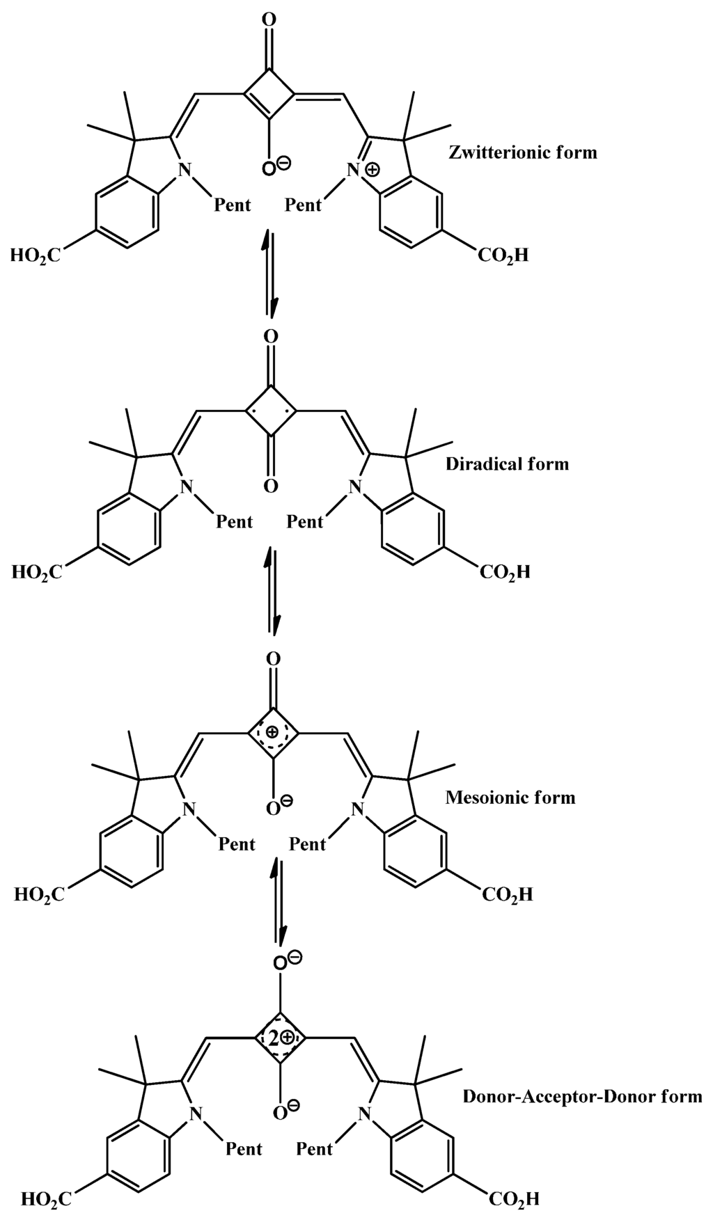 - Srinivas, K.; Prabhakar, C.; Devi, C.L.; Yesudas, K.; Bhanuprakash, K.; Rao, V.J. Enhanced diradical nature in oxyallyl derivatives leads to near infra red absorption: A comparative study of the squaraine and croconate dyes using computational techniques. J. Phys. Chem. A 2007, 111, 3378–3386. [Google Scholar] [CrossRef] [PubMed]