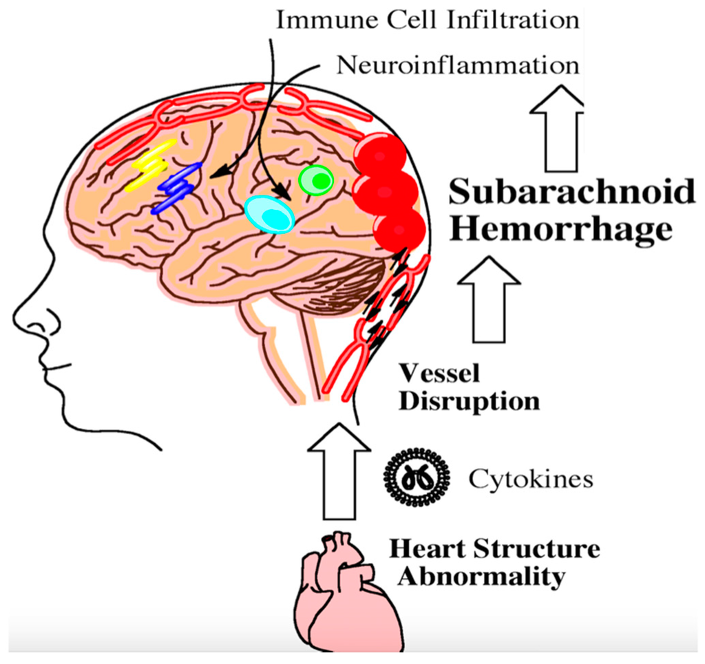 - Mashaly, H.A.; Provencio, J.J. Inflammation as a link between brain injury and heart damage: The model of subarachnoid hemorrhage. Cleve. Clin. J. Med. 2008, 75 (Suppl. 2), S26–S30. [Google Scholar] [CrossRef] [PubMed]