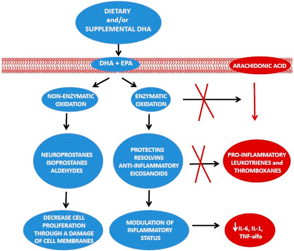 A possible preventative and therapeutic role of DHA in BC development and progression has been highlighted. Robust data indicate several anti-inflammatory effects of DHA suggesting that this ω-3 PUFA may represent a valid candidate for primary and secondary BC prevention in subjects at increased risk as well as BC survivors []. It remains uncertain whether such biological effects of DHA, consisting in altering inflammatory pathways, are clinically relevant at typical dietary doses.