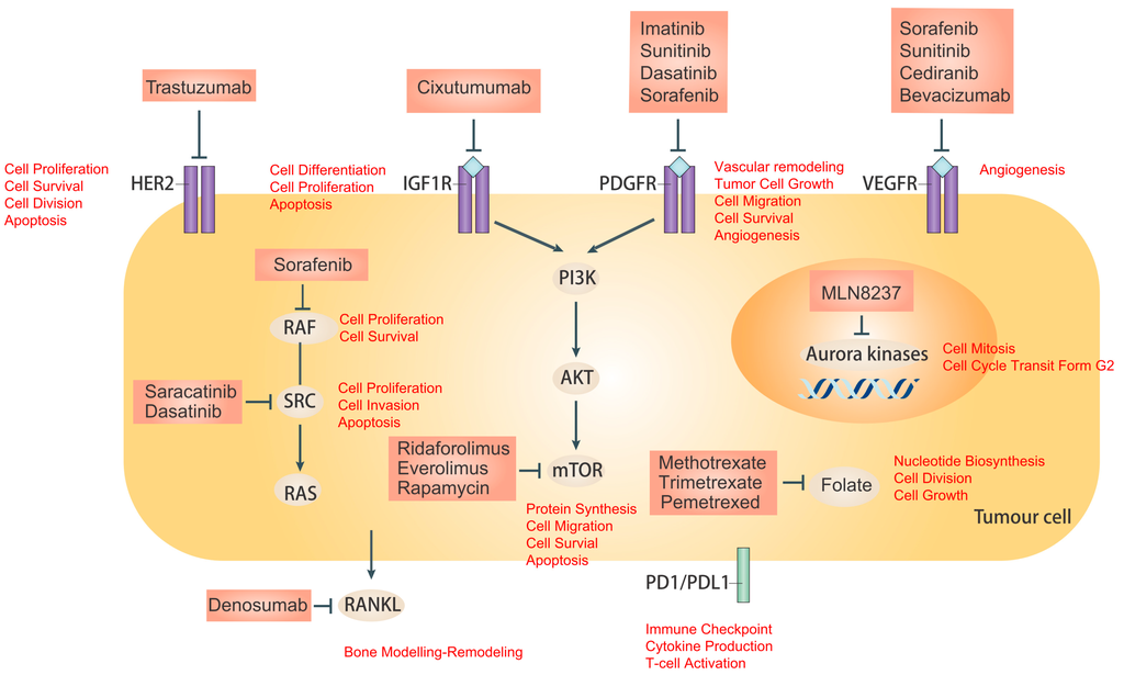 Overview of the targeted therapies in Osteosarcoma. This figure schematically shows molecular targets and associated drugs identified for therapeutic intervention in osteosarcoma. Therapeutic targets include specific cell surface receptor tyrosine kinases (RTKs): HER2, insulin-like growth factor 1 receptor (IGF1R), platelet-derived growth factor receptor (PDGFR), vascular endothelial growth factor receptor (VEGFR); and intracellular signaling targets: steroid receptor co-activator (SRC), RAF, mTOR and aurora kinases. Other potential targets include receptor activator of nuclear factor-κB ligand (RANKL), AKT, mTOR, programmed cell death 1 (PD-1)/programmed cell death ligand 1 (PD-L1), and folate.