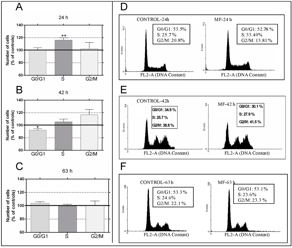 Magnetic field (MF) (50 Hz, 100 µT) effects on cell cycle progression. Samples exposed to MF for 24 h (A) 42 h (B) or 63 h (C) were flow cytometry analyzed after propidium iodide staining. Percentages of diploid cells (DNA content) at G0/G1, S and G2-M phases were determined using CellQuest 3.2 software (BD Biosciences, San Jose, CA, USA). The data, normalized over controls in the corresponding phases (line 100%), are means ± SEM of six experimental runs per time interval. Statistically significant differences with respect to controls: 0.01 ≤ * p < 0.05; 0.001 ≤ ** p < 0.01 (Student’s t-test.) (D–F): Representative cell cycle profiles in sham-exposed controls (left) and samples exposed to the MF (right) for 24, 42 or 63 h, respectively.