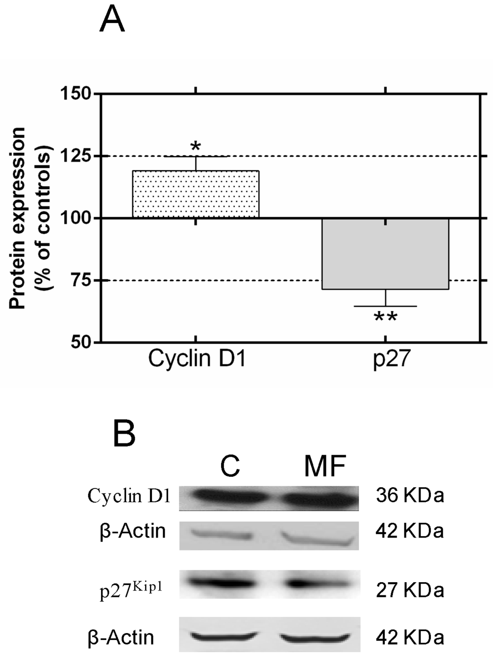 Field effects on cell cycle regulatory proteins. (A) Expression of cyclin D1 and p27kip1 after 120 min of MF- or sham-exposure, using β-actin as loading control. The data, normalized over the respective values of protein expression in sham-exposed controls (line 100%), are means ± SEM of six experimental replicates. Statistically significant differences with respect to controls: 0.01 ≤ * p < 0.05; 0.001 ≤ ** p < 0.01 (Student’s t-test); (B) Representative blots of cyclin D1, p27kip1 and β-actin expression.