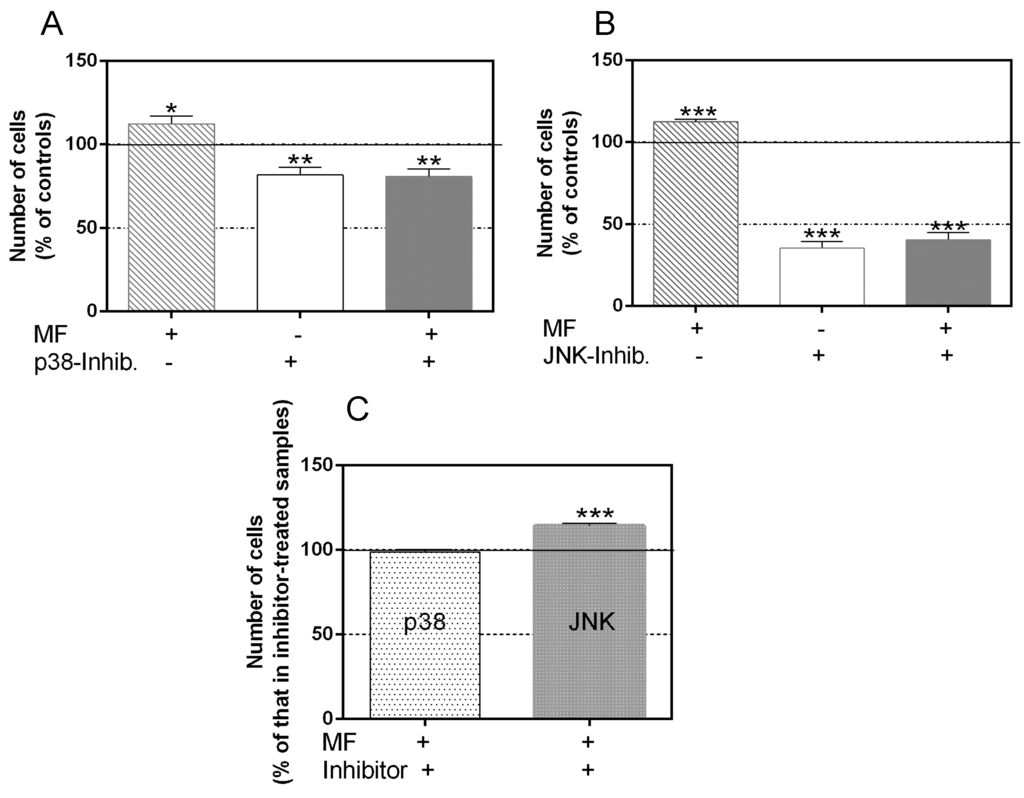 Cell response to 63 h of MF exposure in the presence or absence of MAPK-p38 and -JNK inhibitors. (A) Number of viable cells, determined by Trypan blue exclusion assay, after MF exposure and/or p38-inhibitor treatment. The data, normalized over the respective sham-exposed, untreated controls (line 100%), are means ± SEM of four experimental replicates. Statistically significant differences with respect to controls: 0.01 ≤ * p < 0.05; 0.001 ≤ ** p < 0.01 (ANOVA followed by the Student’s t-test.); (B) Number of viable cells after MF exposure and/or JNK-inhibitor treatment. The data, normalized over the respective sham-exposed, untreated controls (line 100%), are means ± SEM of four experimental replicates. Statistically significant differences with respect to controls: *** p < 0.001 (ANOVA followed by the Student’s t-test.); (C) Cell number after MF exposure in the presence of p38- or JNK- inhibitors. The data, normalized over those in samples sham-exposed in the presence of p38 or JNK inhibitors, are means ± SEM of four experimental replicates. Statistically significant differences with respect to the corresponding inhibitor-treated controls: *** p < 0.001 (Student’s t-test).