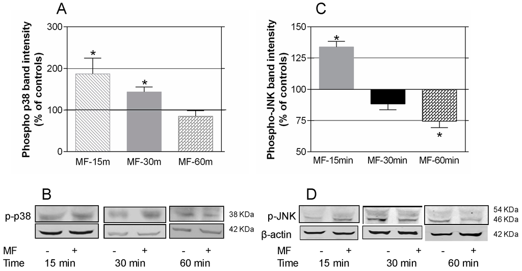 Western blotting was used to further investigate the potential involvement of the MAPK-p38 and -JNK pathways in the MF effects. As shown in Figure 4A,B, shortly after the exposure onset, the field induced increased expression of phospho-p38 (p-p38). Indeed, at 15 min of MF exposure, the effect seemed to be stronger (87.3% over controls; p < 0.05) than at 30 min (43.8% over the corresponding controls; p < 0.05), whereas after 60 min of exposure, the p-p38 expression levels did not differ from those in sham-exposed controls. The levels of phospho-JNK (p-JNK) expression (Figure 4C,D) were also increased after 15 min of MF exposure (33.83% ± 4.55% over controls; p < 0.01). However, the effect was reversed soon after, reaching a significant decrease in p-JNK expression at 60 min of exposure (25.42% ± 5.3% below the corresponding controls; p < 0.01).