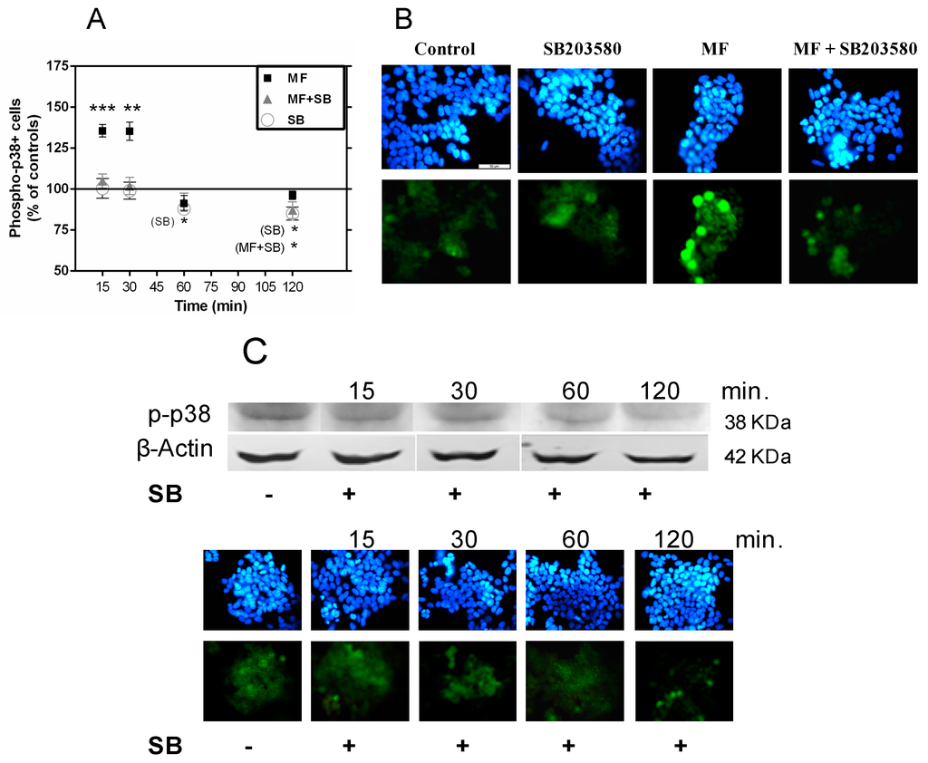 The study of pathways potentially involved in the proliferative response to the MF was extended by immunocytochemical analysis of p-p38 expression. The potential field effects on JNK phosphorilation were not immunofluorescence tested because the data show that the MF-induced increase in cell number is blocked by the inhibition of p38, but not by JNK inhibition. The results in Figure 5A,B show that short, 15 or 30 min exposure to MF significantly increased the number of phospho-p38 labeled cells (p-p38+ cells, 35.6%, p < 0.001 and 35.3%, p < 0.01, respectively, over the corresponding controls), whereas longer exposure intervals, of 60 and 120 min, did not change significantly the percentages of p-p38+ cells with respect to sham-exposed controls. As for the p38 inhibitor, when administered alone for 15 or 30 min, it did not affect the number of p-p38+ cells, but blocked the response to the field at these intervals. However, at 60 min, the p38 inhibitor alone induced significant decrease in the number of p-p38+ cells (88.02% of that in controls p < 0.05). After 120 min of treatment with the inhibitor, alone or in the presence of MF, the number of cells expressing p-p38 was significantly reduced when compared to controls treated with vehicle (85.06% and 87.14% of that in controls, respectively, p < 0.05). These results were supportive of those obtained by immunoblot. The specificity of SB203580 as MAPK-p38 inhibitor was assessed by p38 phosphorylation assays (immunoblots, and immunocytochemistry) showing that 10 µM inhibitor induced a time-dependent reduction of the spontaneous activation of p38, (Figure 5C).
