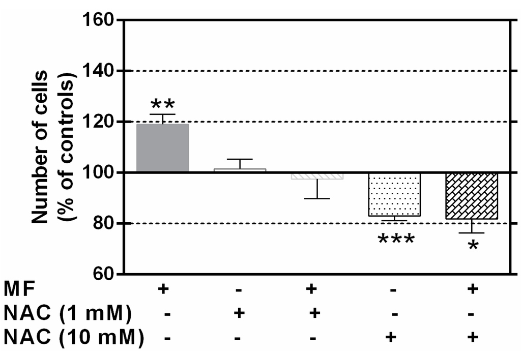 4.8. Long-Term Exposure for Proliferation Assay. Growth Response at the End of a 63-h Lapse of Intermittent Exposure to MF in the Presence or Absence of NAC