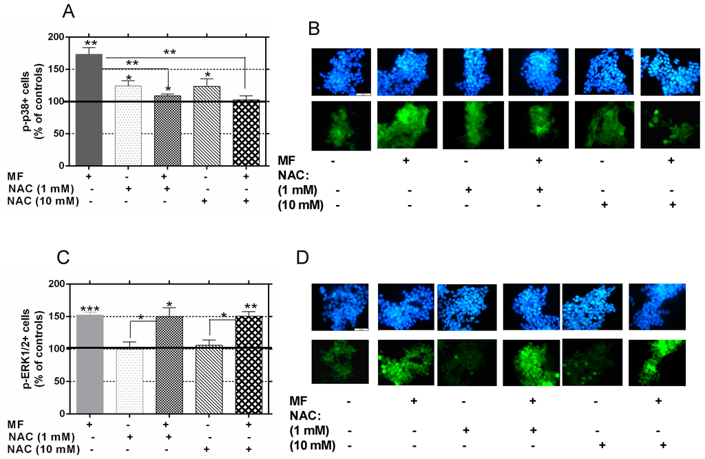 Expression of p-p38 and p-ERK1/2 after 30-minute MF exposure in the presence of 1 or 10 mM NAC. Immunocytochemistry and computer-assisted image analysis. (A) Phospho-p38 positive cells. The data, normalized over sham-exposed controls treated with NAC vehicle (line 100%), are means ± SEM of four replicates per experimental condition. Statistically significant differences with respect to controls: 0.01 ≤ * p < 0.05; 0.001 ≤ ** p < 0.01; *** p < 0.001 (ANOVA and Student’s t-test); (B) Representative images of immunocytochemical staining for p-p38 (lower panels) in control, NAC (1 or 10 mM), MF exposed or MF + NAC samples. Cell nuclei (upper panels) were Hoechst stained; (C) Phospho-ERK1/2 positive cells. The data, normalized over controls (line 100%), are means ± SEM of four replicates per experimental condition. Statistically significant differences with respect to controls: 0.01 ≤ * p < 0.05; 0.001 ≤ ** p < 0.01; *** p < 0.001(ANOVA and Student’s t-test); (D) Representative images of immunocytochemical staining for p-ERK1/2; same notations as in (B). Scale bar = 50 µm.