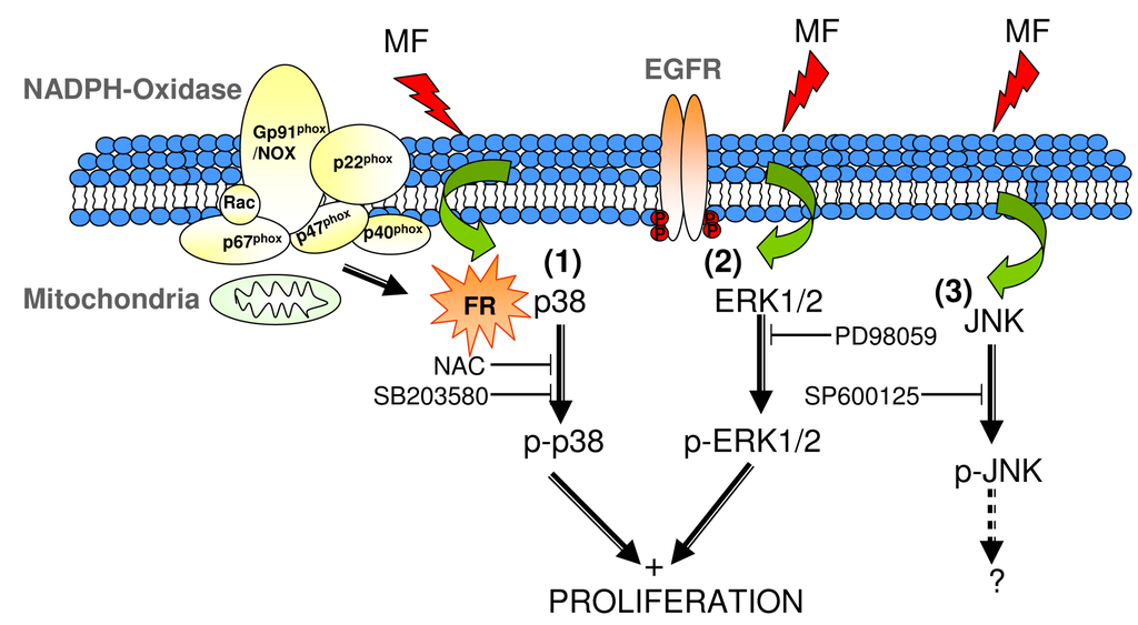 It is conceivable that, as suggested by others, NAC can act either as an antioxidant or a pro-oxidant, depending on the experimental conditions [,]. Our results are consistent with those reported by Menon and coworkers [] showing that NAC exerts an immediate (within 1 h) pro-oxidant effect, acting later on as an antioxidant agent. This view is consistent also with our results obtained by supplementing the medium with NAC 1 h prior to MF-or sham-exposure onset. Indeed, it can be postulated that the increased phosphorylation of p38 observed in controls at 90 min of sham-exposure would have occurred during the preceding 60 min of incubation with NAC. As for the effect of the MF exposure for the last 30 of the total 90 min of incubation with NAC, the antioxidant action of NAC would prevail and block the MF-induced promotion of p-p38 expression. Since NAC has elicited a pro-oxidative response in this study, the potential involvement of free radicals in the activation of p38 by the MF must be further investigated using different approaches. In any case, the fact that NAC inhibits field effects on p38 suggests that redox regulation of p38 could be a relevant mechanism mediating in the proliferative response to the MF. Besides, since the blocking of the proliferative effect by NAC does not interfere with the activation of ERK1/2 by the field, it is likely that the MF can activate both pathways through independent ways. And still, as mentioned before, the activation of both pathways has shown to be a determinant in the proliferative response of NB69. Taken together, these results corroborate the hypothesis that FR are involved in a number of reported effects of ELF MF [], and provide support to the experimental results that link the proliferative effects of 50 Hz MF to ROS generation []. Also, MF-induced increases in FR have been shown to be related to mitochondrial alterations [] or to changes in the enzymatic complex NADPH oxidase []. Although the present study has not investigated the FR source potentially affected by the MF, it can be proposed that involvement of the mitochondria or the NADPH oxidase in the potential increase of FR could be a cause for the herein reported MF-induced early activation of p38. Such activation would act as a triggering factor that, with the necessary contribution of the ERK1/2 activation, would result in the observed proliferative response to the MF (Figure 8).