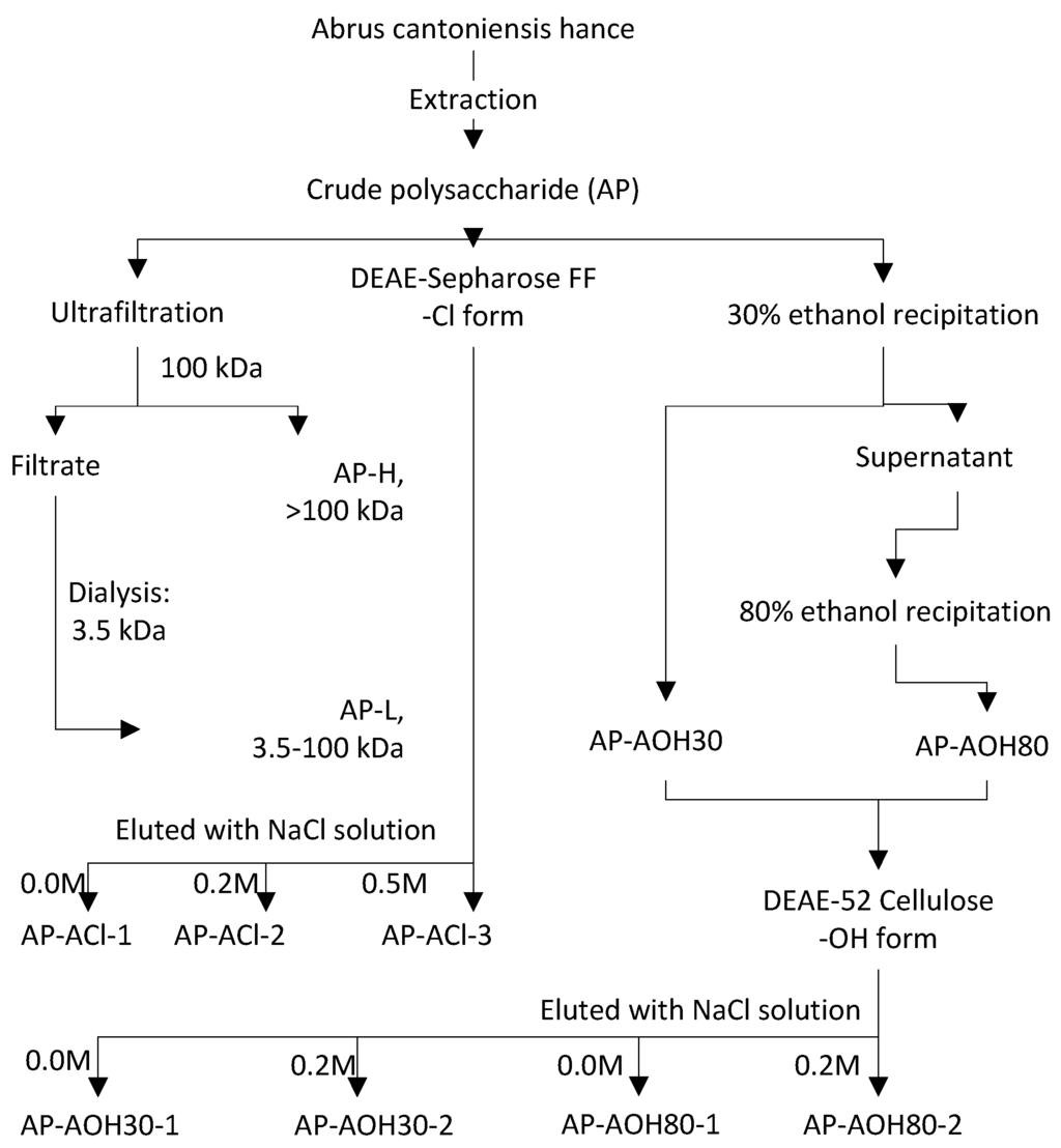 To the best of our knowledge, there is a paucity of research available describing the influences of different downstream purification processing techniques on the structure and bioactivities of polysaccharides in A. cantoniensis, or fundamental research to explain the underlying mechanisms. The purified polysaccharide can be obtained by various downstream isolation and purification processing, such as ethanol precipitation, membrane separation, fractional precipitation, acidic precipitation with acetic acid, anion-exchange chromatography, gel filtration, and affinity chromatography [13]. Therefore, to fully exploit the potential of the polysaccharide of A. cantoniensis and find a suitable purifying process, DEAE-exchange chromatography was combined with stepwise ethanol precipitation and membrane separation leading to the production of nine polysaccharide fractions namely: AP-AOH30-1, AP-AOH30-2, AP-AOH80-1, AP-AOH80-2, AP-ACl-1, AP-ACl-2, AP-ACl-3, AP-H and AP-L. Additionally, the chemical properties and the in vitro anti-tumor and immunomodulatory activities of the polysaccharide fractions were evaluated.