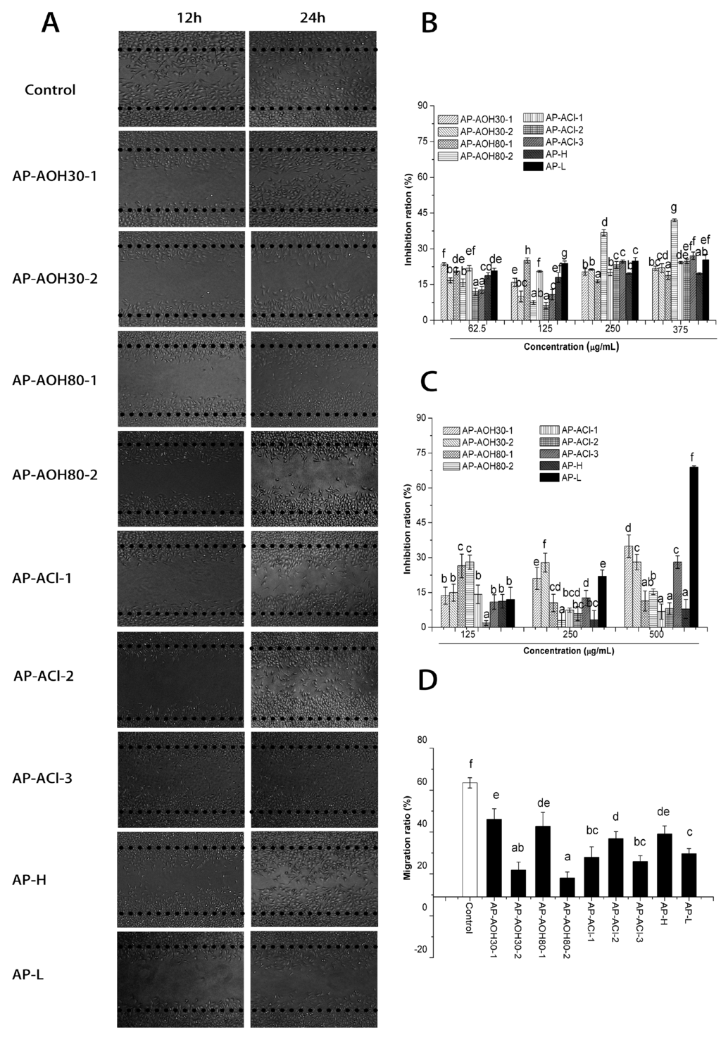 A wound healing assay was employed to investigate the effects of migration inhibition by the polysaccharide fractions. MCF-7 cell migration was attenuated after APF treatment for 24 h, shown in Figure 2A. Compared to 63.51% of for the control shown in Figure 2D, the migration rate of MCF-7 was greatly inhibited by AP-AOH80-2, AP-AOH30-2, AP-ACl-3 and AP-ACl-1 with the migration rate of 18.02%, 21.84% and 25.90%, respectively. Furthermore, the inhibition rate of MCF-7 proliferation induced by these three fractions was no more than 30% at the concentration of 250 µg/mL (shown in Figure 2C), suggesting that their effect on MCF-7 cells is primarily migration inhibition rather than a direct cytotoxic effect.