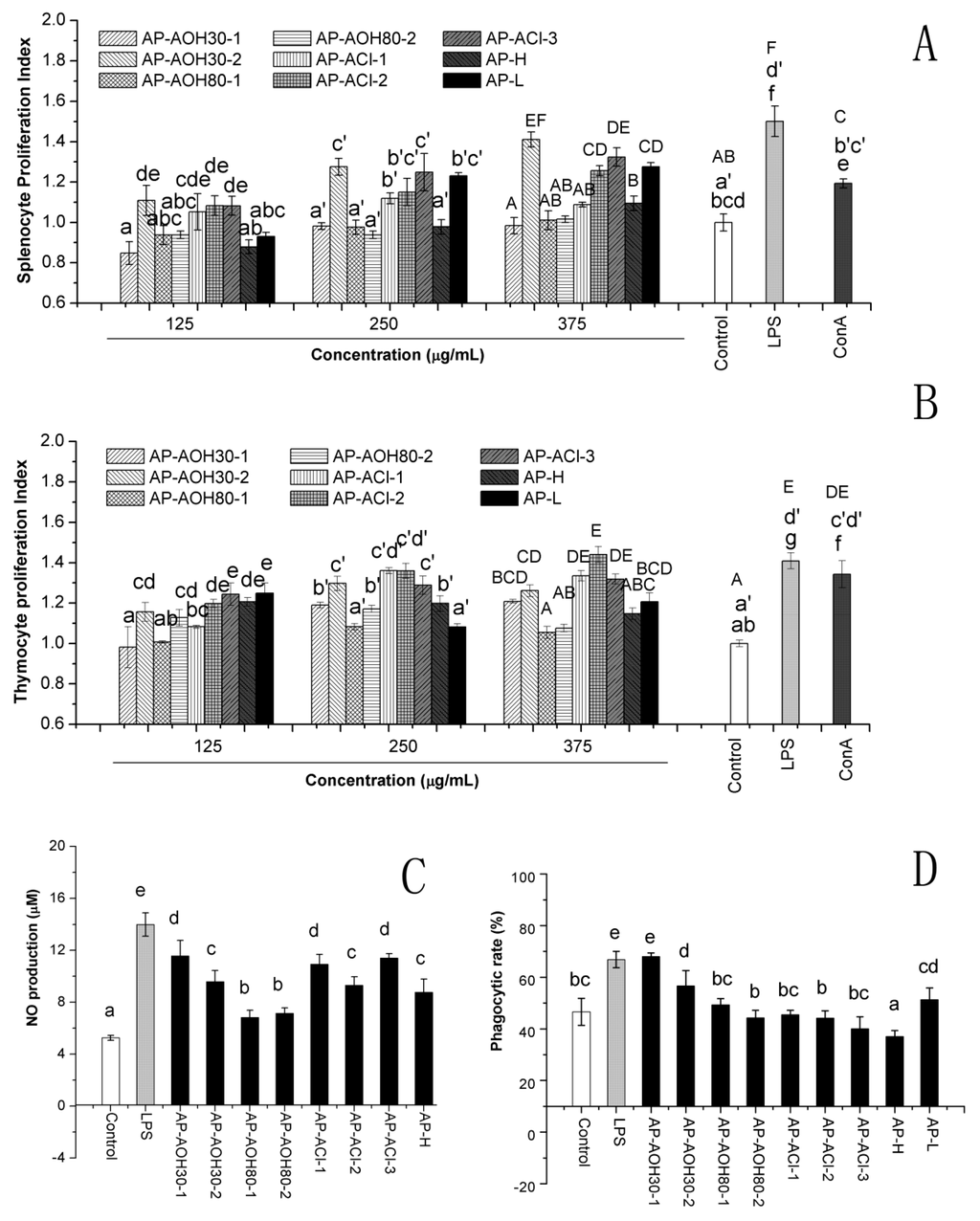 In vitro influences of APF on the splenocyte proliferation (A) and thymocyte proliferation (B), NO production (C) and phagocytic activity (D) of peritoneal macrophages. Data are expressed as the means ± SD. a–g, a’–d’, A–F Mean values in the column with different letters are significantly different (p < 0.05).