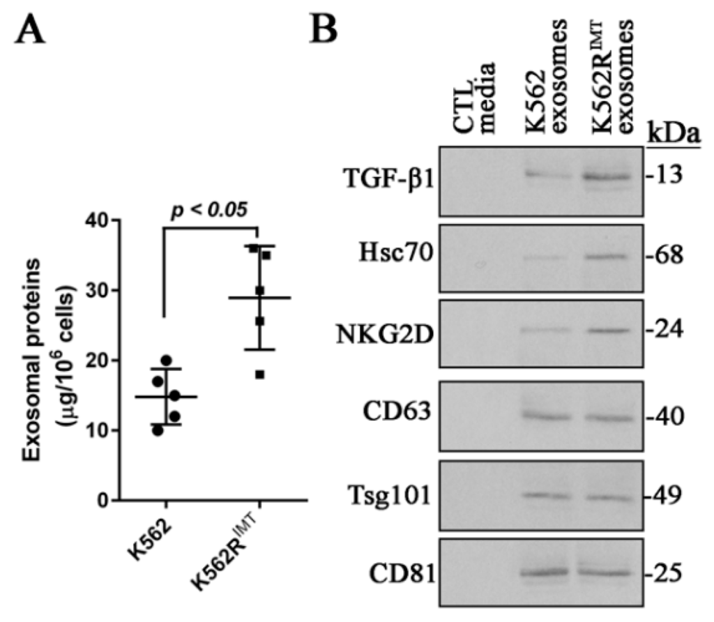 Culture media were ultra-centrifuged at 100,000× g for 16 h at 4 °C to remove exosomes that may be possibly present in media. K562 or K562RIMT cells were cultured in a 150-cm2 flask for 24 h in ultra-centrifuged media, and then the cultured media were collected for exosome purification as described previously [12]. Briefly, the media were centrifuged progressively at 300× g for 10 min, 2000× g for 10 min, and then filtered through a 0.22 µm filter. Effluent was ultra-centrifuged at 100,000× g for 2 h. The exosomal pellets from 5 replicate experiments were resuspended in PBS, and then the content of exosomal protein was determined using BCA assay (Thermo Scientific, Waltham, MA, USA).