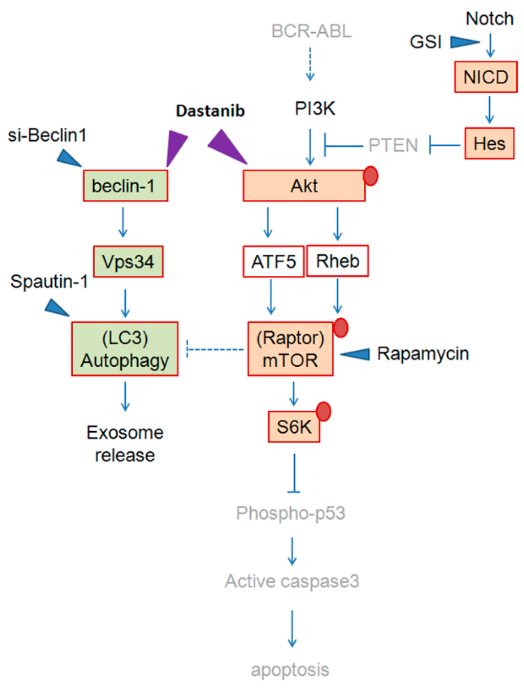In imatinib-resistant K562 cells, BCR-ABL level is decreased. Reduction of PTEN via Notch/Hes-1 signaling leads to the PI3K/Akt/mTOR pathway activation, which is responsible for upregulation of p-p70S6KThr389 and thus inhibition of apoptosis. GSI and rapamycin, not spautin-1, results in induction of apoptosis. In addition, activation of autophagy through mTOR-independent beclin-1/Vps34 signaling enhances exosome release since beclin-1 knockdown and spautin-1 treatment, not rapamycin, prevents exosome release. Dasatinib induces p-p53Ser15/active caspase 3 expression and thus promotes apoptosis by inhibiting the mTOR/p70S6KThr389 activity via downregulation of AktSer473 activation, and decreases exosomal release by inhibiting autophagy activity via downregulation of beclin-1 and Vps34. GSI: Notch1 γ-secretase inhibitor; Spautin-1: autophagy inhibitor; Rapamycin: mTOR inhibitor; si-Beclin-1: knockdown of beclin-1 by siRNA. Red circle: phosphorylation status.