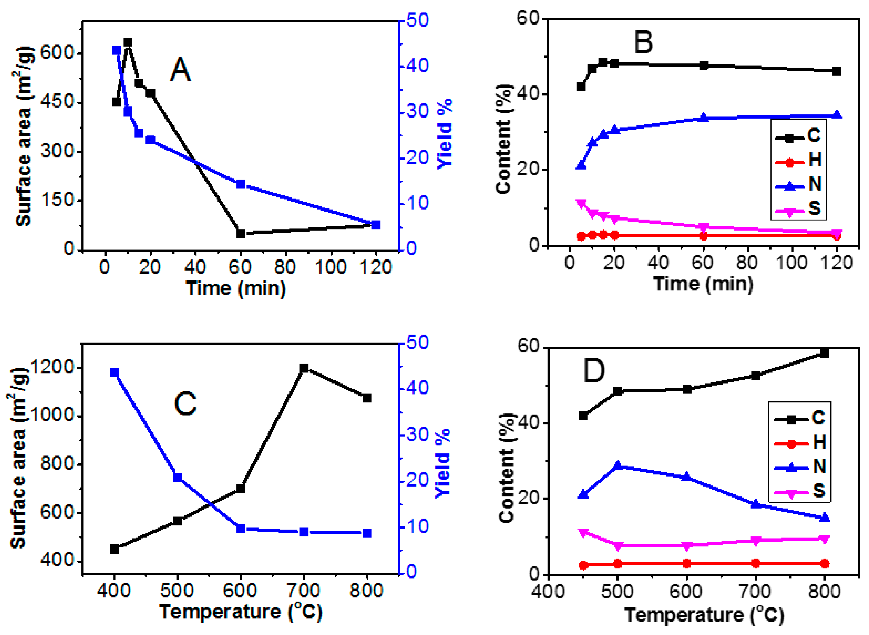 | Entry | Temperature (°C) | Time (min) | SBET (m2/g) | Yield (wt %) | Nitrogen Content (wt %) |