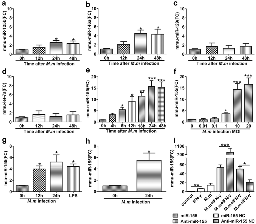 Distinguishing expression of miRNAs in M.m infected macrophages. (a–e) Expression of miR-125b, miR-146a, miR-129, Let-7a and miR-155 in RAW 264.7 cells after M.m infection for the indicated times; (f) Expression of miR-155 in RAW 264.7 cells at different multiplicities of infection (MOI) for 24 h; (g) miR-155 expression levels were detected in THP-1 cells after M.m infection or lipopolysaccharide (LPS) (100 ng/mL) treatment; (h) miR-155 expression level was examined in mouse peritoneal macrophages (MPMs); (i) miR-155 expression was detected in RAW 264.7 cells after transfected with miR-155 Negative Control (NC), miR-155, anti-miR-155 NC and anti-miR-155 prior to infection with M.m or treatment with IFN-γ/M.m for 24 h. All miRNAs were detected by quantitative real-time polymerase chain reaction (PCRs) (qPCRs). U6 snRNA was used as endogenous control. Experiments were executed with at least three biologically independent replicates, data were shown as the mean ± SEM. * p < 0.05, ** p < 0.01, *** p < 0.001. FC: fold change.