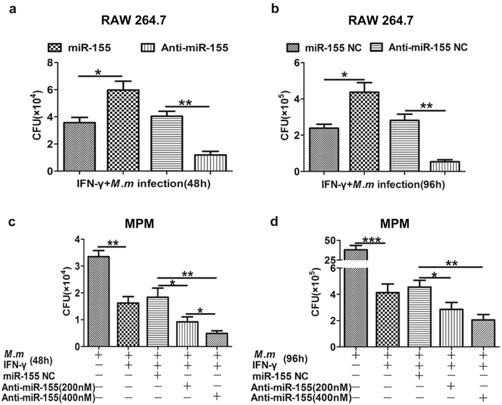 miR-155 negatively regulates the antimycobacterial activity of IFN-γ activated macrophages. RAW 264.7 cells (a,b) and MPM (c,d) were transfected with miR-155 NC, miR-155 or anti-miR-155 NC, anti-miR-155 prior to infection with IFN-γ/M.m for 48 and 96 h, and intracellular M.m survival was quantified by Colony Forming Unit (CFU) assays at the indicated time points. All data represent the mean ± SEM from three independent experiments, * p < 0.05, ** p < 0.01, *** p < 0.001.