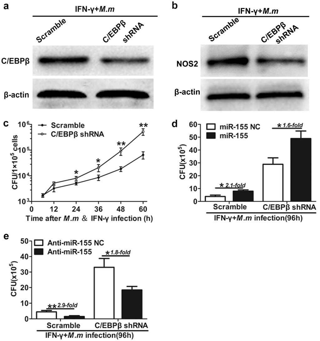 Reports have suggested that NO is essential for intracellular mycobactericidal activity [31,32]. Previous studies also demonstrated that C/EBPβ participates in NOS2 gene regulation [34,36,37,38,39] and NOS2 exerts potent intracellular mycobactericidal activity [31,32]. To identify whether the effect of miR-155 on modulating antibacterial activity of C/EBPβ is exerted through NOS2, we detected the effects of knockdown of C/EBPβ on antibacterial activities using IFN-γ activated macrophages after being infected with M.m. Firstly, RAW 264.7 cells were infected with either copGFP-shRNA-C/EBPβ (C/EBPβ-Knockdown) or copGFP-scramble (C/EBPβ-Wild Type) lentiviral particles. After 48 h, copGFP-expressing RAW 264.7 cells were, respectively, infected with IFN-γ/M.m for 20 h. We found that shRNA specific to mouse C/EBPβ significantly inhibited the expression of C/EBPβ (Figure 5a). To explore whether C/EBPβ affects the expression of NOS2 in IFN-γ activated RAW 264.7, we assessed the expression of NOS2 in the absence of C/EBPβ, following M.m infection. Lentiviral transduction of C/EBPβ shRNA decreased the levels of NOS2 in IFN-γ activated RAW 264.7 infected with M.m (Figure 5b). This indicated that C/EBPβ takes part in NOS2 modulation in IFN-γ activated RAW 264.7 cell infected with M.m. Moreover, C/EBPβ markedly exerts antibacterial activity in shRNA-scramble cells compared to knockdown of C/EBPβ cells infected with M.m after 24 h (Figure 5c). These data suggested that C/EBPβ is essential for antibacterial activities by IFN-γ activated macrophages infected with M.m.
