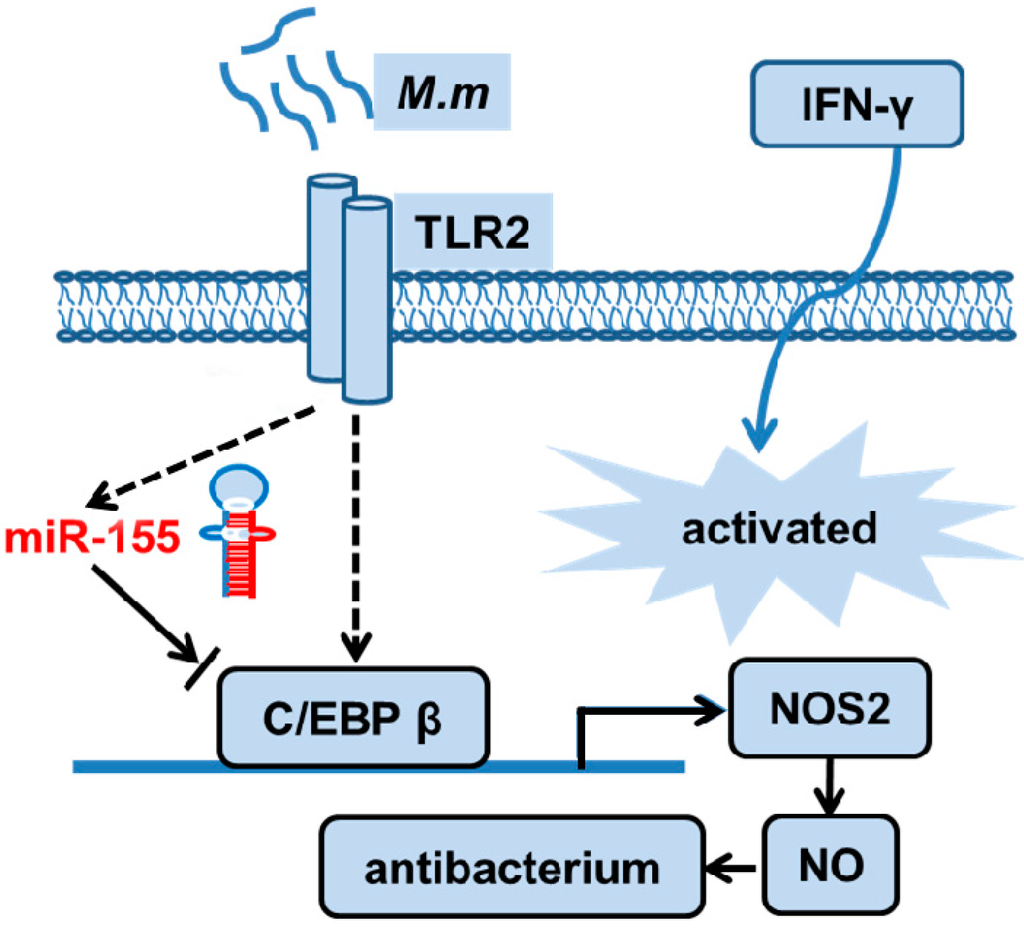 Schematic outline of miR-155-regulated bactericidal activity. miR-155 expression is induced by M.m in IFN-γ activated macrophages and mediates translational inhibition of C/EBPβ by targeting its 3′UTR. Successively, C/EBPβ is induced and mediates NO-dependent antibacterial mechanism. Thereby, miR-155 can negatively regulate the NO-dependent antibacterial mechanism by C/EBPβ. Black dash line arrow: direct effect; black solid line arrow: indirect effect; blue arrow: activated.