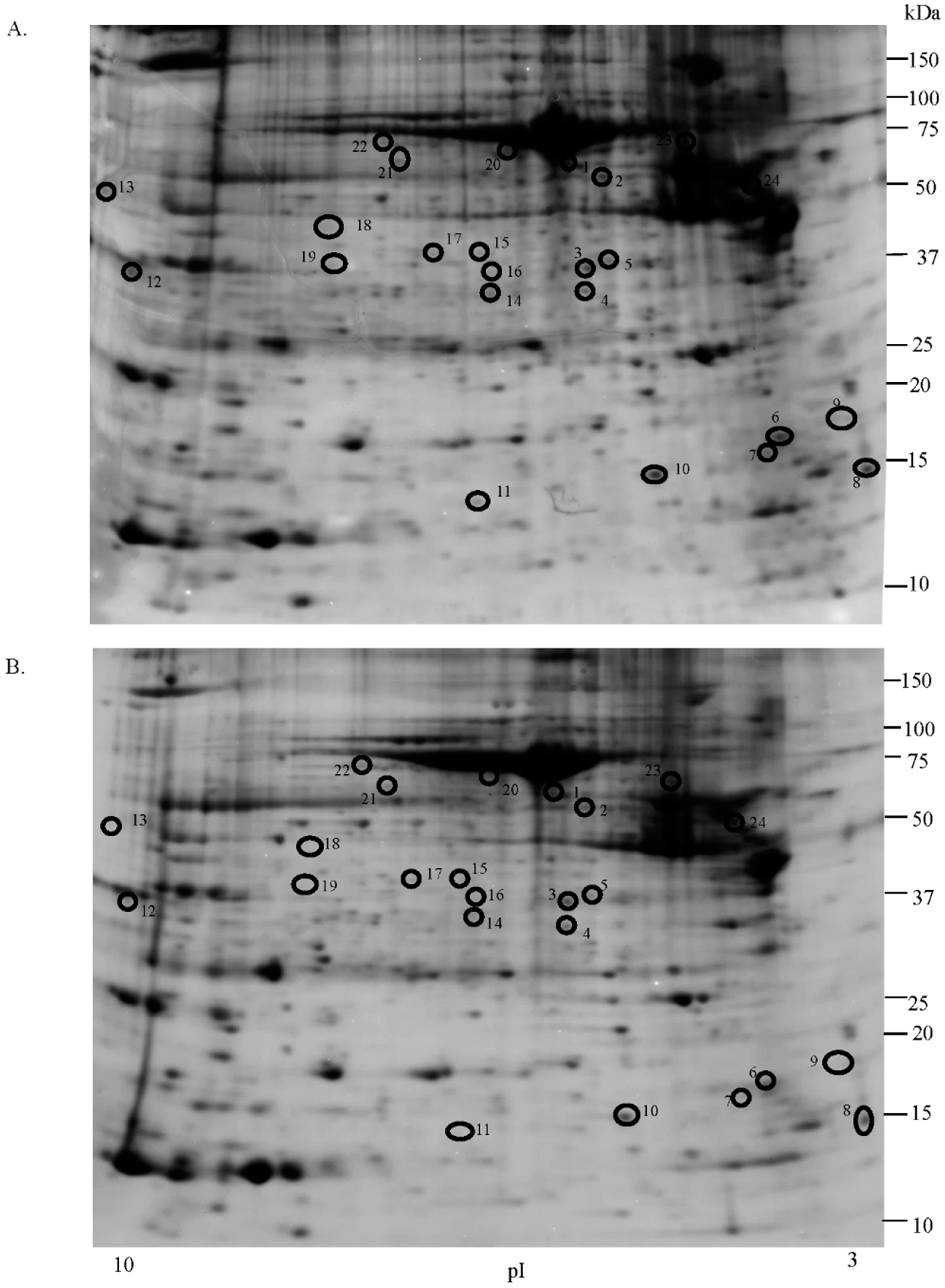 Two-dimensional electrophoresis map of uterine leiomyoma (A) and normal myometrium (B) proteome. Black circles indicate up-regulated protein spots. Immobilized pH gradient 3–10 NL strips were used for the first dimension, and 12.5% polyacrylamide gel was used for the second dimension.