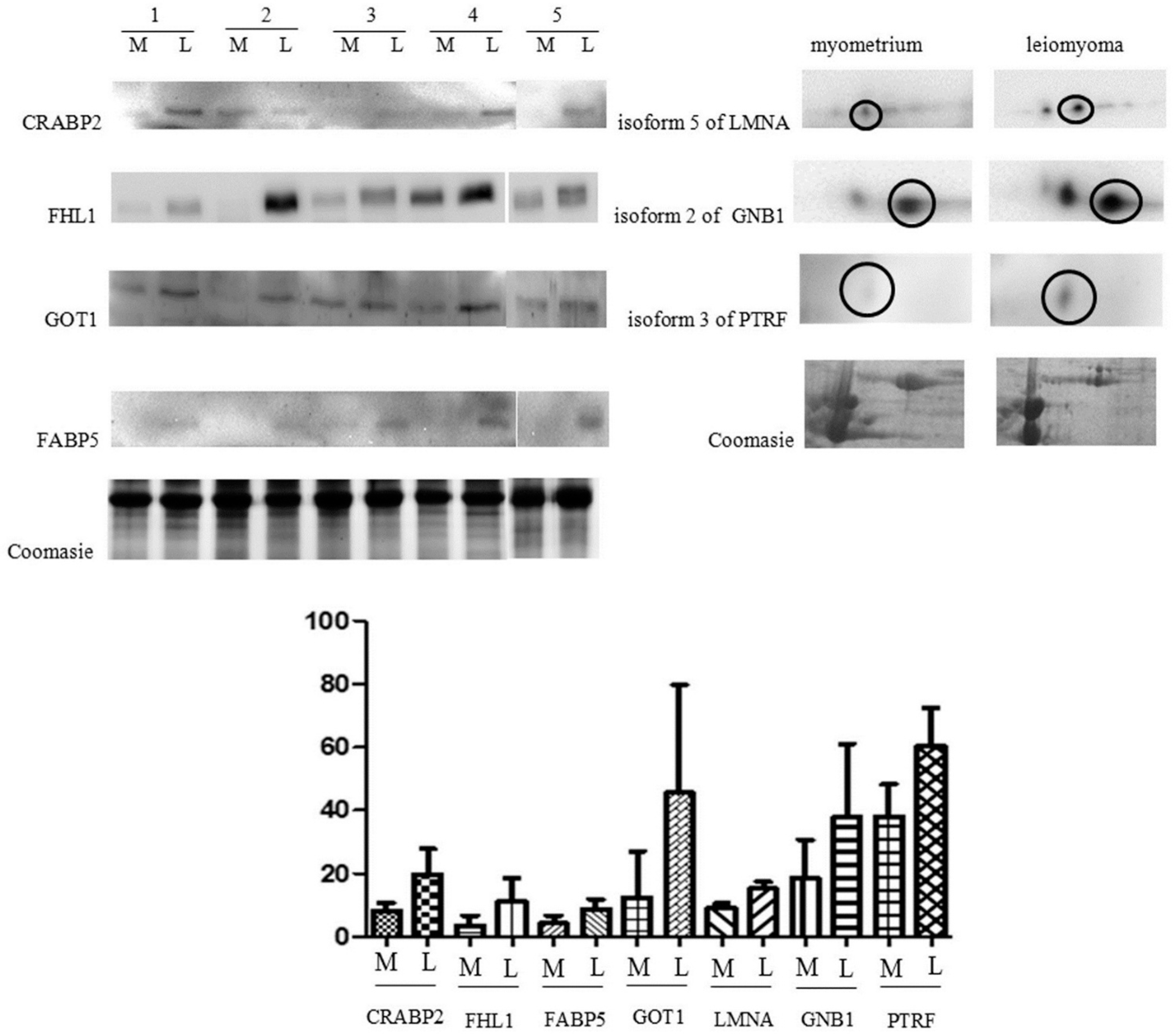 Western blot analysis of CRABP2, FHL1, FABP5, GOT1, isoform 5 of LMNA, isoform 2 of GNB1 and isoform 3 of PTRF in paired myometrium (M) and leiomyoma (L). The isoform corresponding to the one identified by 2-DE is circled. The intensity of immunostained bands was normalized against the total protein intensities measured from the same blot stained with Coomassie brilliant blue. The bar graph shows the relative expression (band density) of proteins in the myometrium and the leiomyoma. The results are shown as a histogram (mean) with whiskers representing the standard deviation. All differences were found to be significant (Wilcoxon signed-rank test for matched samples, p < 0.05).
