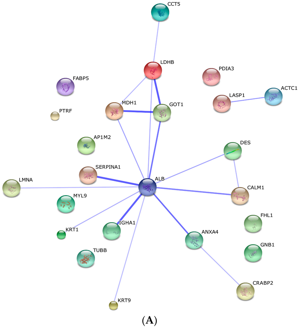 Twelve proteins (PDIA3, CCT5, LDHB, isoform 2 of guanine nucleotide-binding protein G(I)/G(S)/G(T) subunit β-1, MDH1, GOT1, ANXA4, CRABP2, isoform 3 of polymerase I and transcript release factor, FABP5, FHL1 and SERPINA1) were found to be associated with the metabolic process, according to the PANTHER prediction. The STRAP software instead locates these proteins mainly in the extracellular region, cytoplasm, macromolecular complex, cytoskeleton and in other intracellular organelles (Figure 5).