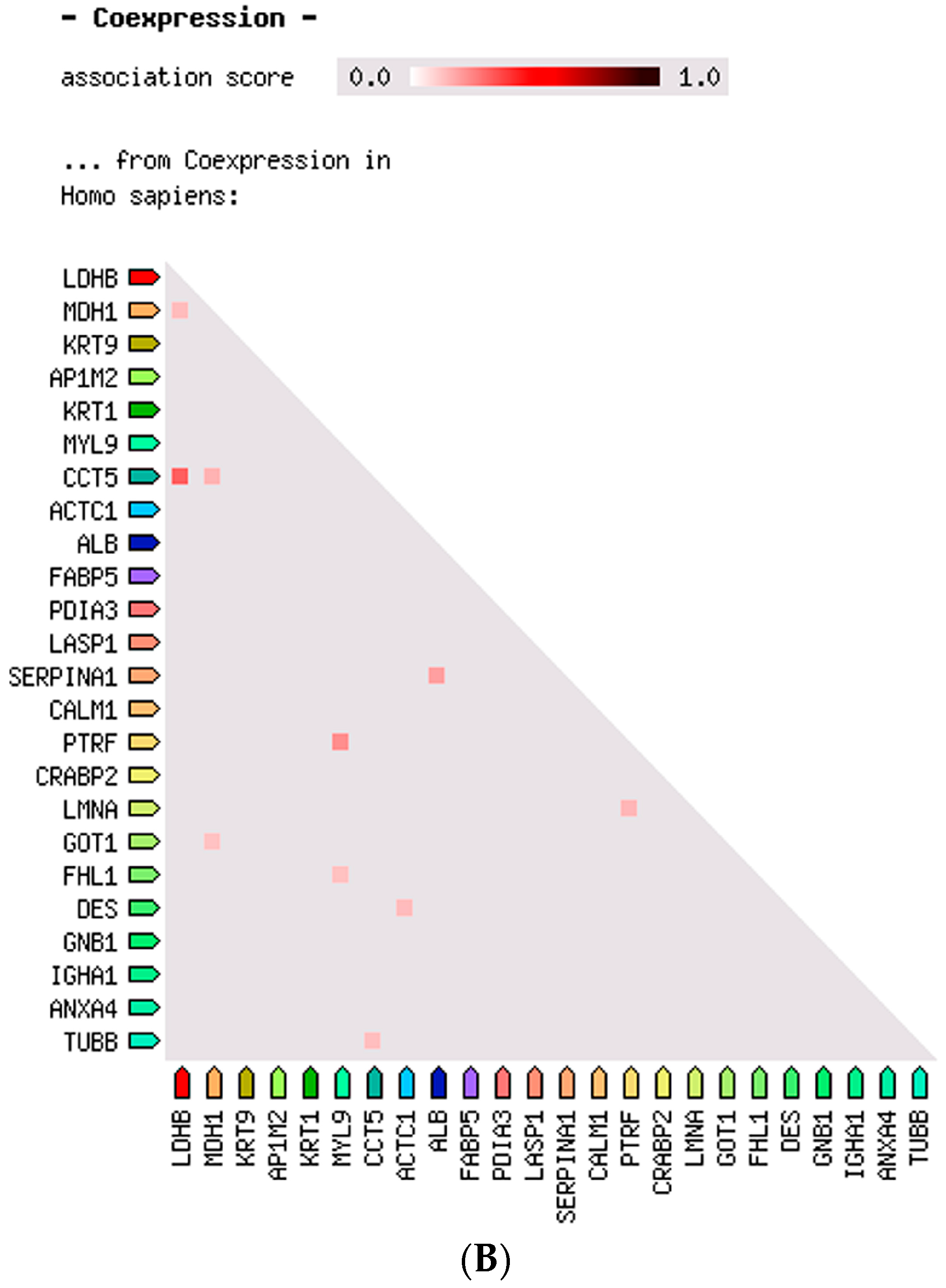 The STRING software elaborated a protein–protein interaction network based on confidence prediction. Further, leiomyoma protein–protein interaction was analyzed for co-expression mapping. There appears to be an interesting strong association among the genes of three metabolic enzymes: between LDHB and GOT1 (combined score: 0.964) and between GOT1 and MDH1 (combined score: 0.982). We further analyzed the co-expression mapping (Figure 3), and the most significant co-expression was found between CCT5 and LDHB. In addition, PTRF co-expresses with KRT1, CCT5 co-expresses with MHI1; GOT1 co-expresses with MHI1; and MHI1 co-expresses with LDHB; indicating not only an interaction between LDHB, GOT1 and MDH1, but also a possible association between them and the leiomyoma.