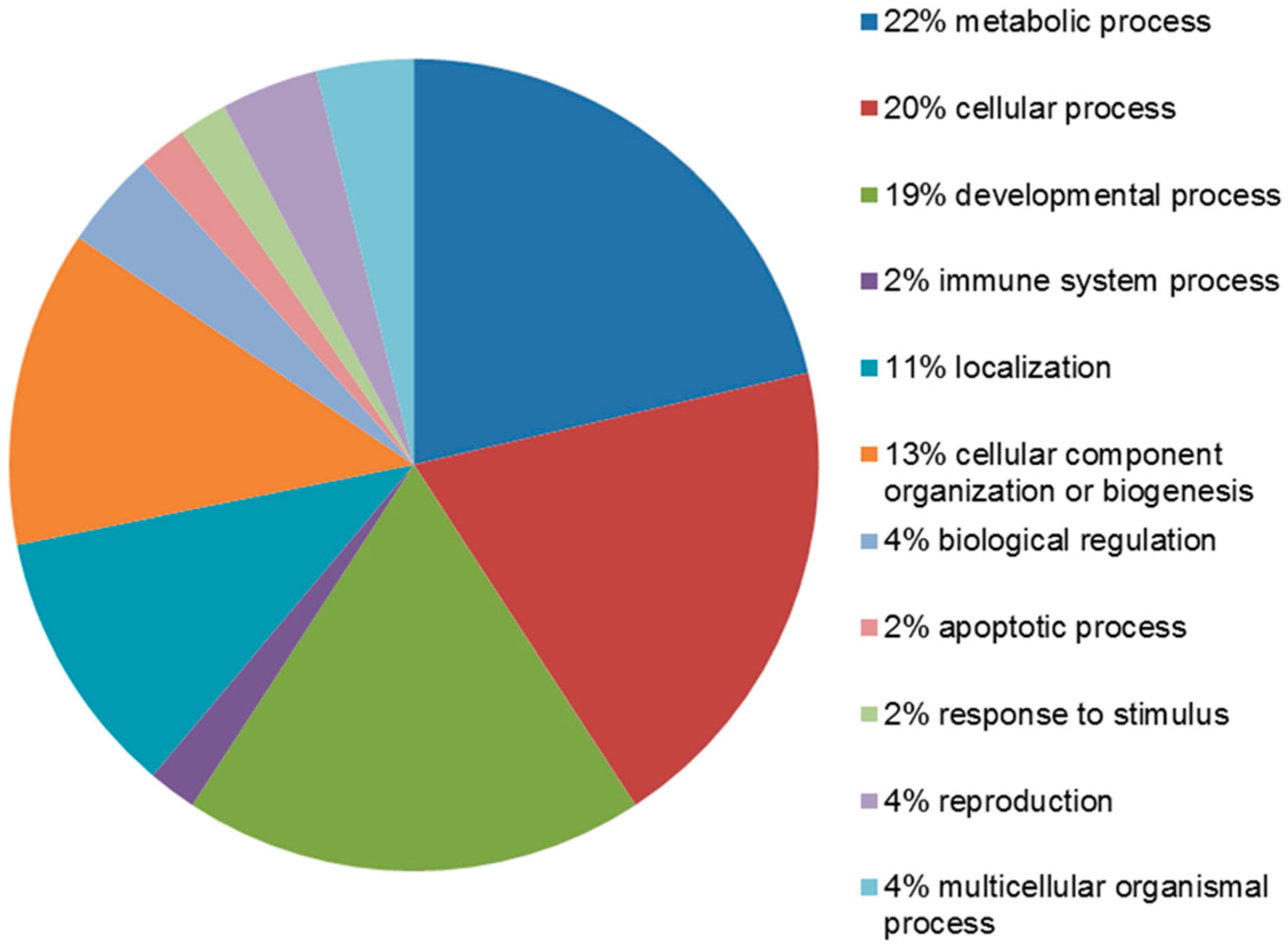 The identified proteins were divided into groups, based on the PANTHER classification system and using the STRAP 5.1 software, according to their biological processes and cellular composition. In terms of biological processes, the proteins were grouped into four main categories: metabolic process, cellular process, developmental process and cellular component organization or biogenesis (Figure 4).