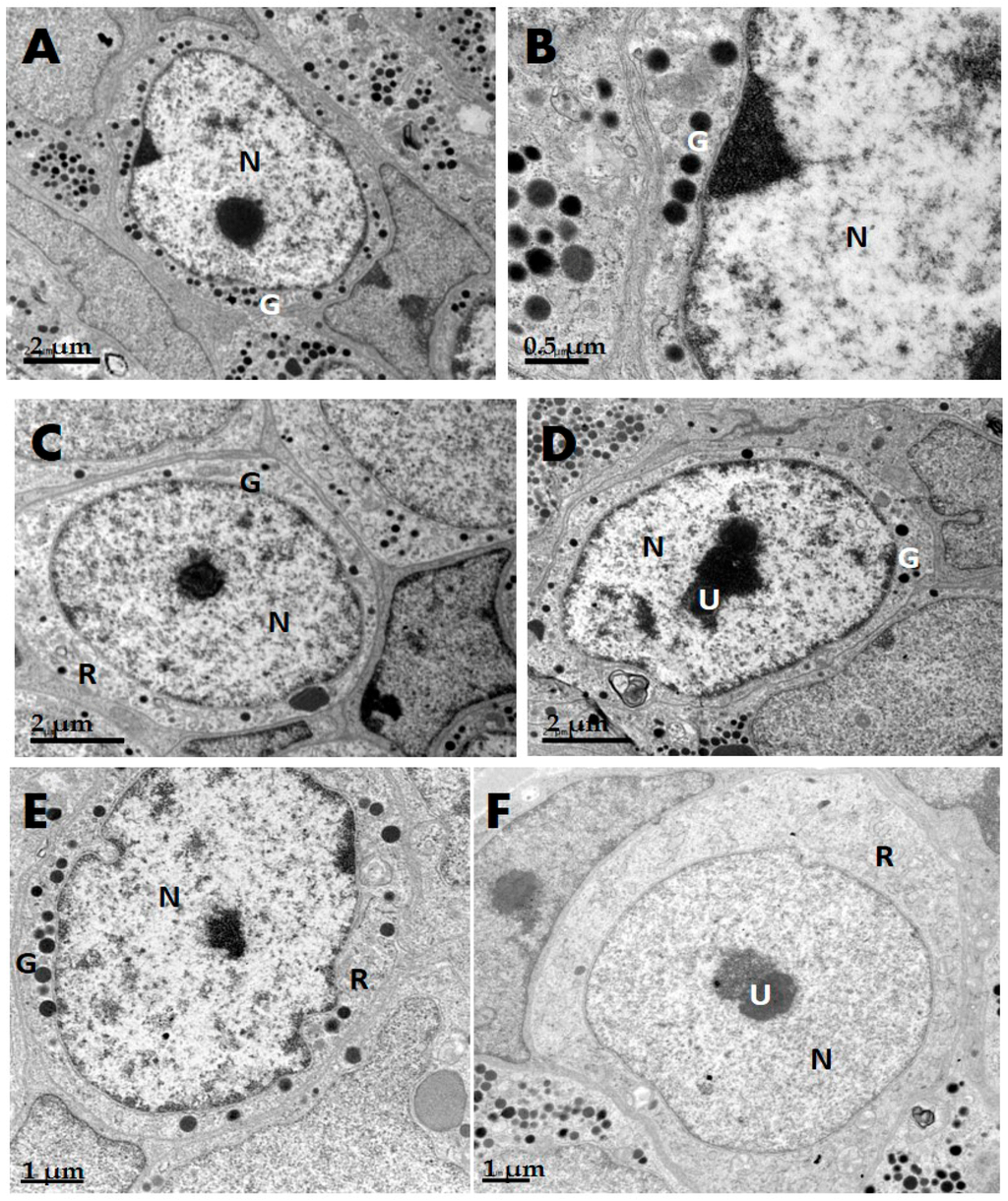 Chinemys reevesii pituitary GH cell ultrastructure in the winter. (A) A GH cell showing a few secretory granules and a big nucleus; (B) An enlarged section of (A) showing secretory granules in the cytoplasm; (C) appearance of the rough endoplasmic reticulum and ribosomes in GH cells; (D) nucleoli located in the center of a nucleus; (E) a GH cell showing depressed border of nucleus and scarce secretory granules; (F) a GH cell with no observable secretory granules. N, Nuclei; G, Secretory granules; R, Rough endoplasmic reticulum; U, Nucleoli.