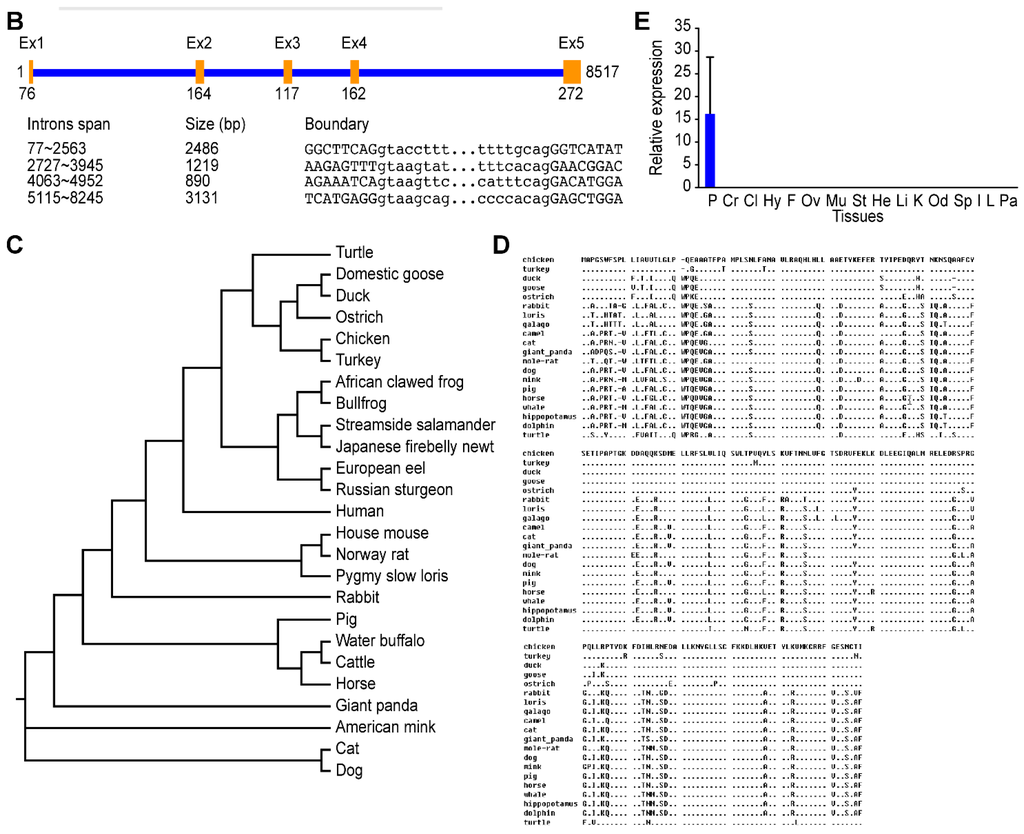 Chinemys reevesii GH cDNA sequence and gene characteristics. (A) The italic letters represent the 5′- and 3′-untranslated regions. The lowercase letters represent the coding sequence, with the corresponding protein sequence below. The shadowed letters represent ATG, TGA, tail signals, and the polyadenylation sequence aataaa in the 3′-region. Capital letters show amino acids for each codon upside, whereas * refers to stop codon. The primers GHF and GHR are single-underlined. The TGSP1 and TGSP2 5′-RACE and 3′-RACE primers are double-underlined; (B) Structural characteristics of C. reevesii GH gene. Capital letters are exon sequences; lower case letters are intron sequences; (C) Phylogenetic tree representing GH cDNA from various animal species; (D) Comparison of GH amino acid sequence homology in different species; (E) GH gene expression in various tissues from C. reevesii. P, pituitary; Cr, cerebrum; Cl, cerebellum; Hy, hypothalamus; F, fat; Ov, ovary; Mu, muscle; St, stomach; He, heart; Li, liver; K, kidney; Od, oviduct; Sp, spleen; I, small intestine; L, lung; Pa, pancreas.