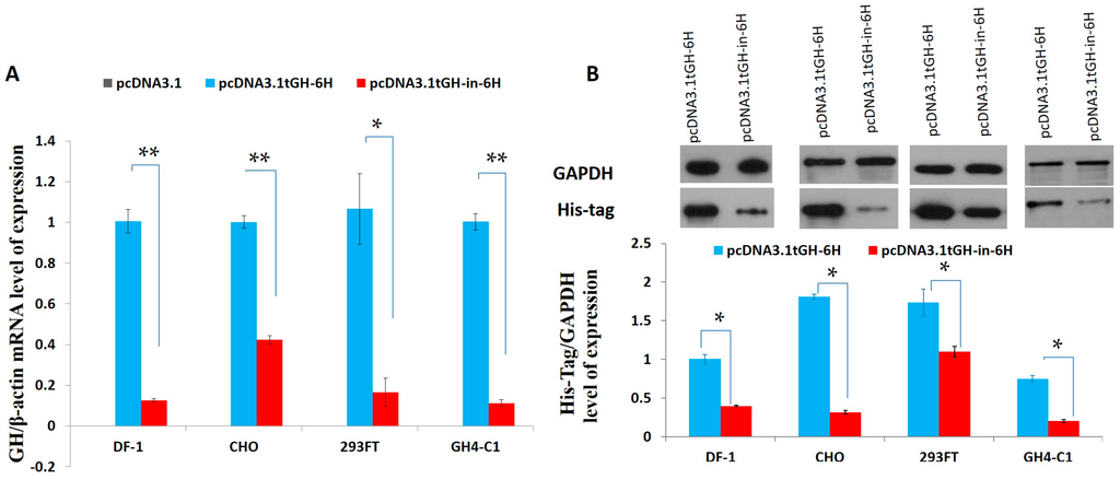 The expression of tGH-in-6H were only 13%, 42%, 17%, and 11% of the pcDNA3.1tGH-6H expression level in DF-1, CHO, 293FT, and GH4C1, respectively (p < 0.05) (Figure 5A). The mean expression level of the His-tagged protein was recorded by Western blot assays. The expression of tGH-in-6H were only 39%, 18%, 63%, and 27% of the pcDNA3.1tGH-6H expression level in the four cell lines (Figure 5B).