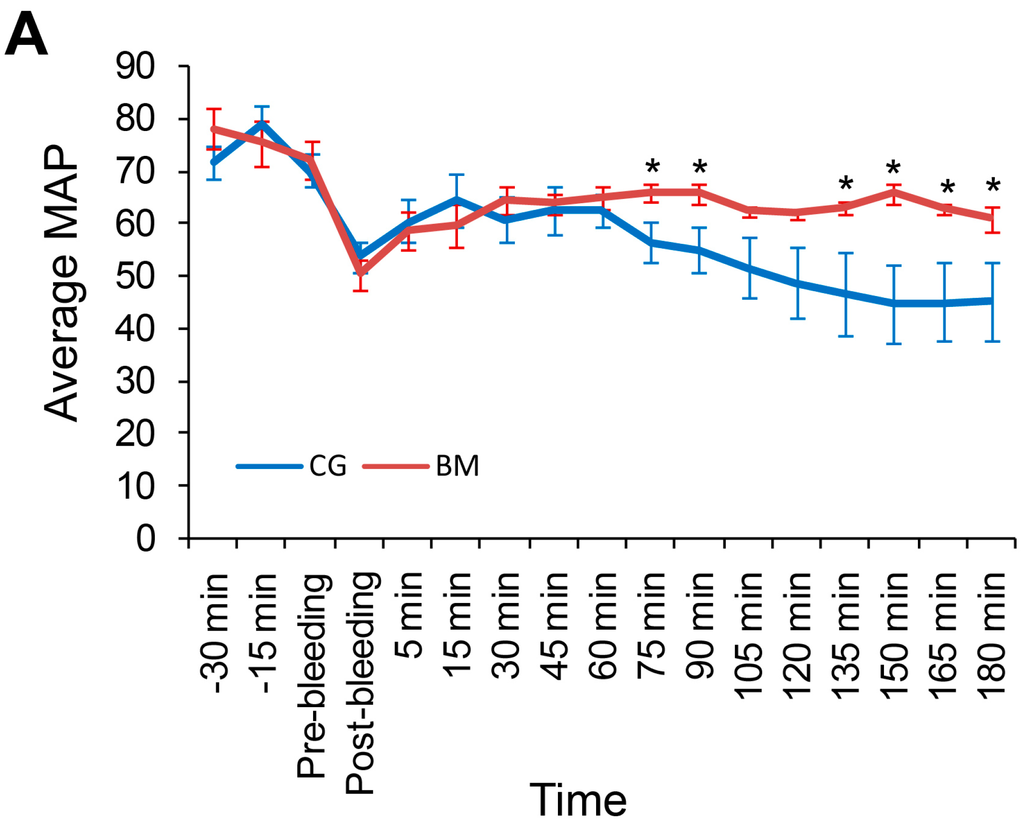 The hemostatic condition of the swine within the experiment is shown as mean MAP in Figure 1A. Baseline pressures (Table 1) decreased sharply post injury, and hemorrhage did not differ significantly between groups. The MAP significantly differed at 75, 90, and 135–180 min after injury for animals treated with BM compared to those treated with CG (p < 0.05), with the animals in the BM group showing MAP improvement after injury.