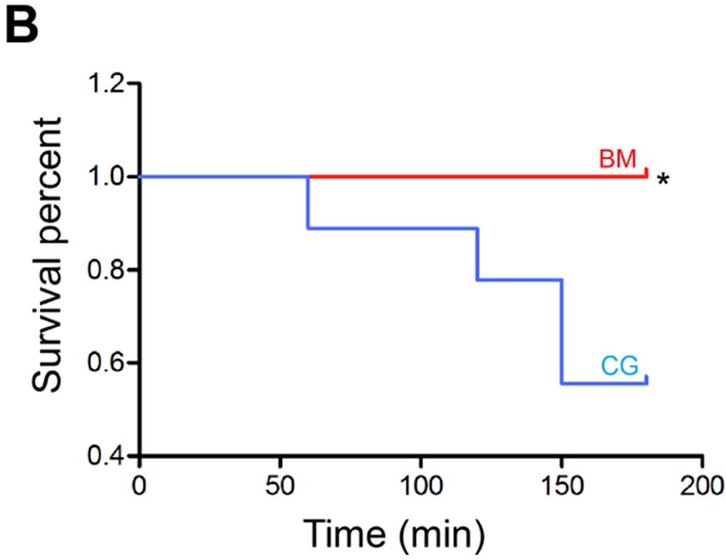 Animals in the BM group survived longer compared to those in the CG group (180 ± 0 min vs. 150.4 ± 14.0 min, Table 2). All 11 (100%, 71.51%–100%) BM-treated and 5/9 (55.6%, 21.3%–86.4%) CG-treated animals lived for the entire experiment (Figure 1B, p < 0.05) with final MAPs of 60.7 ± 2.3 mmHg and 45.1 ± 7.5 mmHg, respectively (Table 1, p < 0.05).
