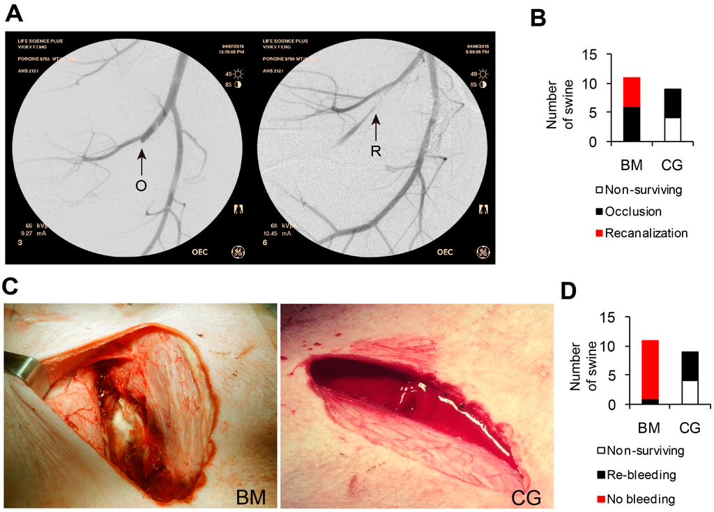 Angiogram of surviving animals and Morphological assessment after removal of tested materials. The femoral artery was occluded at the injury site in 100% of animals treated with CG (5/5) and in 54.5% of animals treated with BM (6/11). In 45.5% (5/11) of animals treated with BM, the artery was narrowed at the injury site but blood was present in the distal femoral artery. Video angiogram analysis demonstrated anterograde flow (not retrograde from collateral circulation). After CG removal, 100% of hemostatic clots ruptured and re-bleeding occurred. In contrast, 90.9% of injuries treated with BM demonstrated stable hemostatic clots with sticky gels over the arterial injury site. (A) Representative images from fluoroscopic angiography. The arrow indicates the artery injury site. O: occlusion; R: recanalization; (B) Number of animals with injured artery recanalization or occlusion; (C) Representative images of injury site after product removal; (D) Number of animals with or without re-bleeding after product removal.