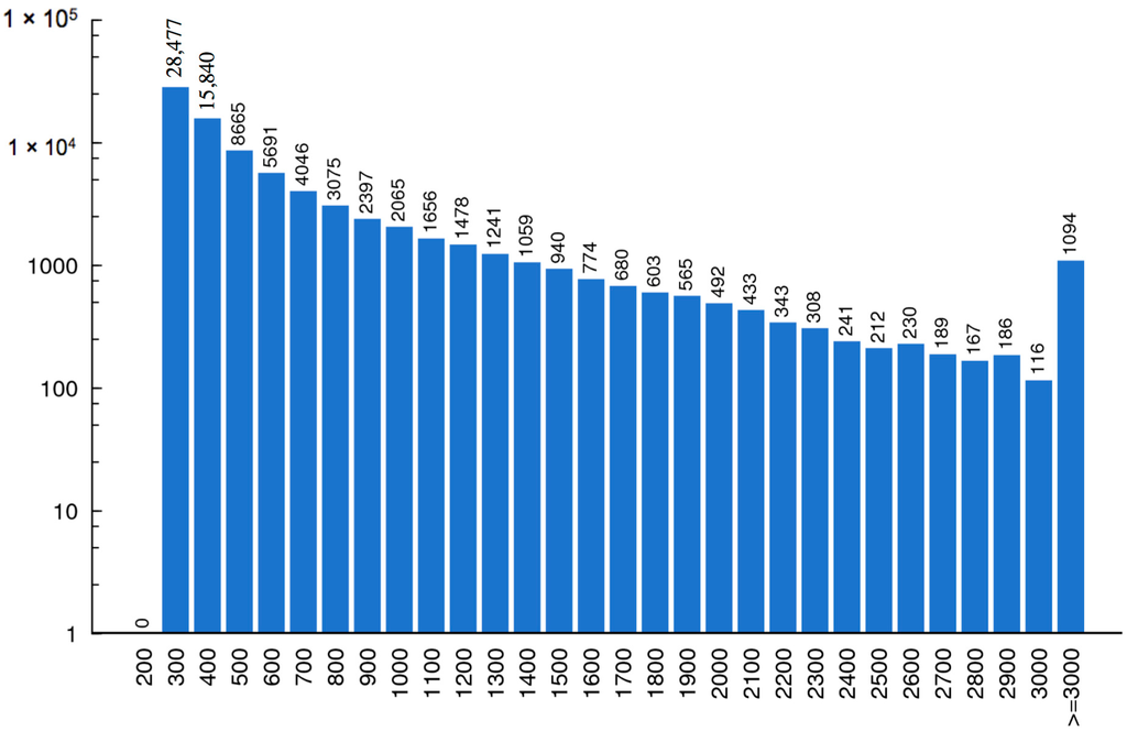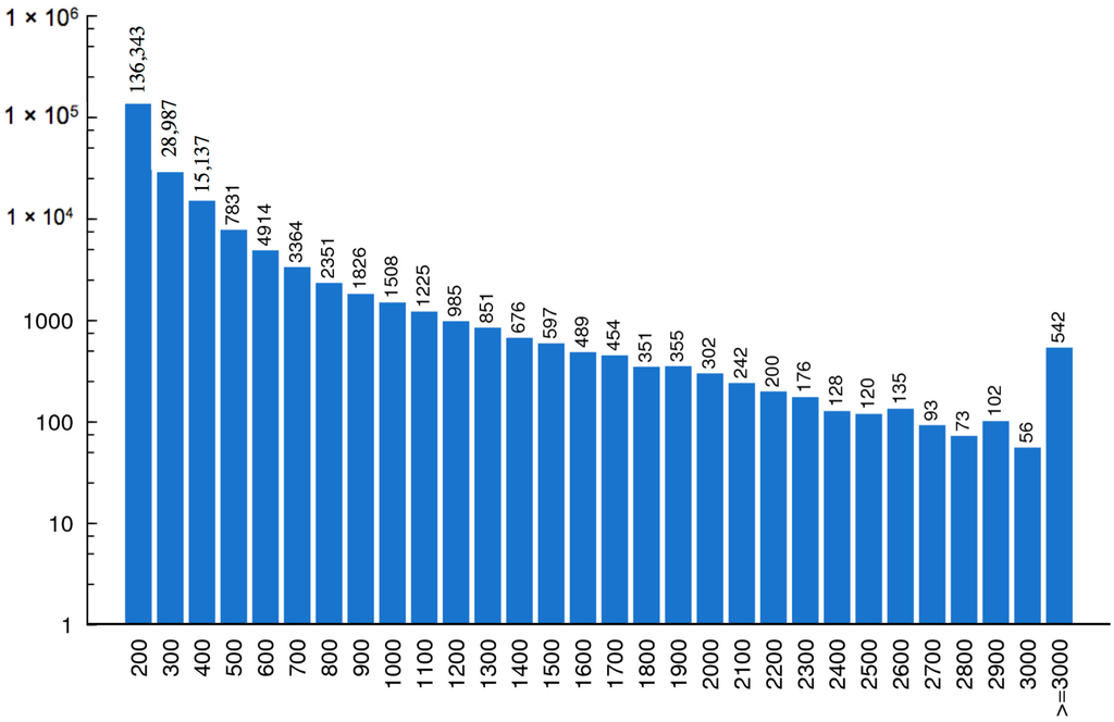 Length distribution of contigs. The horizontal coordinate represents contig length and the vertical coordinates stand for the number of contigs.