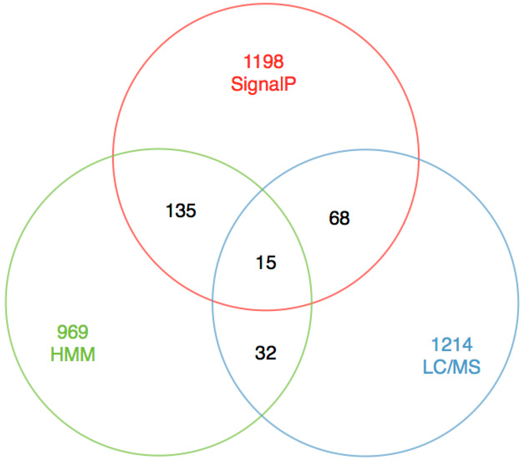 The statistics for SignalP, HMM search, LC-MS/MS and their mutual overlaps.