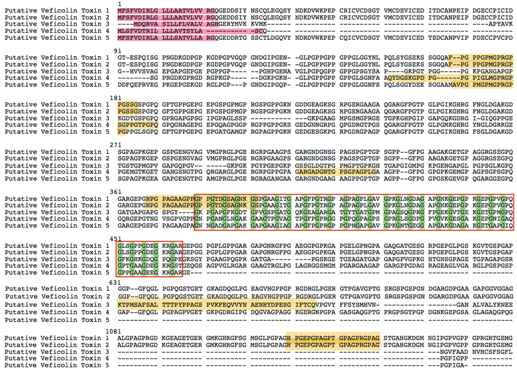 We found five transcripts (Figure 5) homologous to the Veficolin toxin sequences (homologies’ alignments in Supplementary S3). Veficolin was first identified in snake venom and then Anguimorpha lizard, but its function was not clearly characterized [1]. We find a domain contains large numbers of G-X-Y repeats: an alignment contains 20 copies of the G-X-Y repeat that form a triple helix [1]. The first position of the repeat is glycine, the second and third positions can be any residue but are frequently proline and hydroxyproline. Domains with this pattern are post translationally modified by proline hydroxylase to form the hydroxyproline residues, and defective hydroxylation is the cause of scurvy [26]. Thus, we infer that the veficolin might cause scurvy as well, which is in accordance with the symptoms caused by getting stuck by those spines from the Chinese yellow catfish.