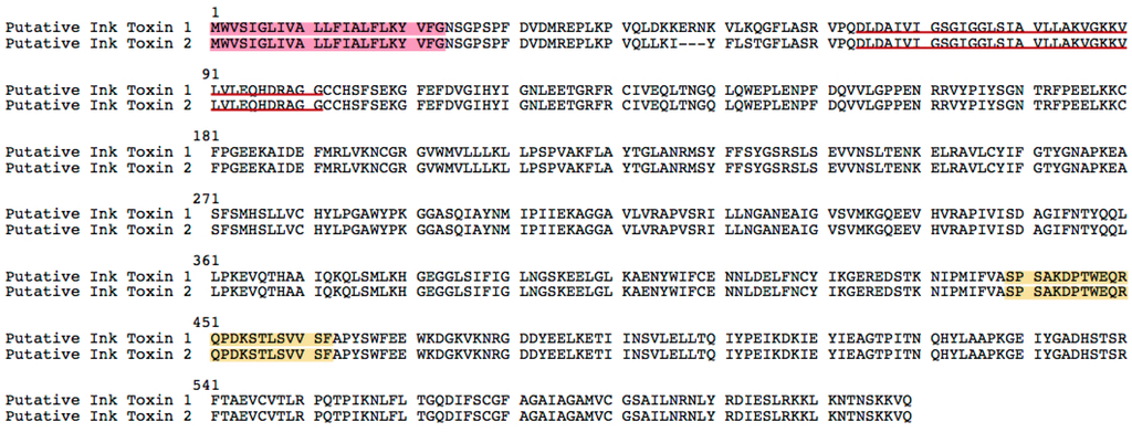 The putative Ink toxin sequences from Chinese yellow catfish. Sequences in the red background are signal peptides. Peptides in the yellow background are verified by LC-MS/MS analysis. The red underlined regions are the FAD domains.