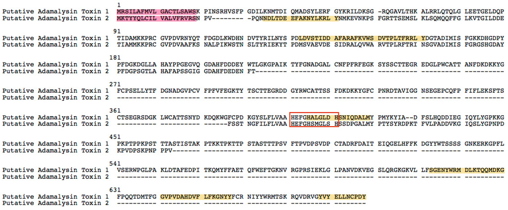 Two transcripts (Figure 7) encoding Adamalysin were identified in our transcriotome data (homologies’ alignments in Supplementary S5). Adamalysin, which requires zinc and calcium for its activity, is a toxin protein firstly isolated from the venom of Eastern diamond back rattlesnake (Crotalus adamanteus) [32]. The adamalysins comprise an elongated zinc binding consensus sequence HEXXHXXGXXH and a so-called “Met-turn” forming the hydrophobic base of the catalytic zinc-binding site. The three histidine residues of the consensus sequence are involved in zinc ligation, and the glutamic acid residue presumably is the general base in catalysis [33,34].
