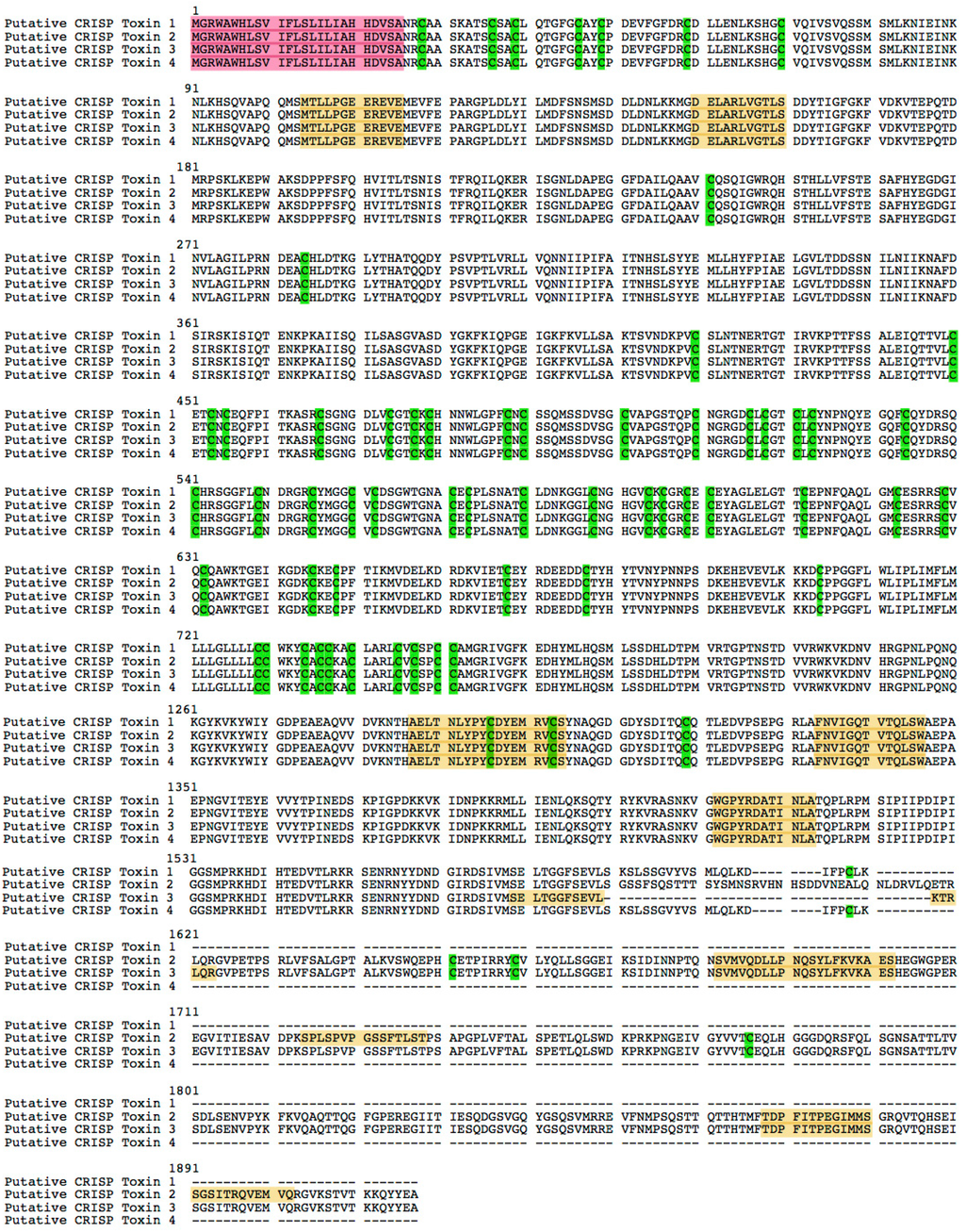 The putative CRISP toxin sequences from Chinese yellow catfish. Sequences in red background are signal peptides. Peptides in yellow background are verified by LC-MS/MS analysis. The amino acid Cysteine is marked in green. Dashed lines means the absence of corresponding amino acid sequences.