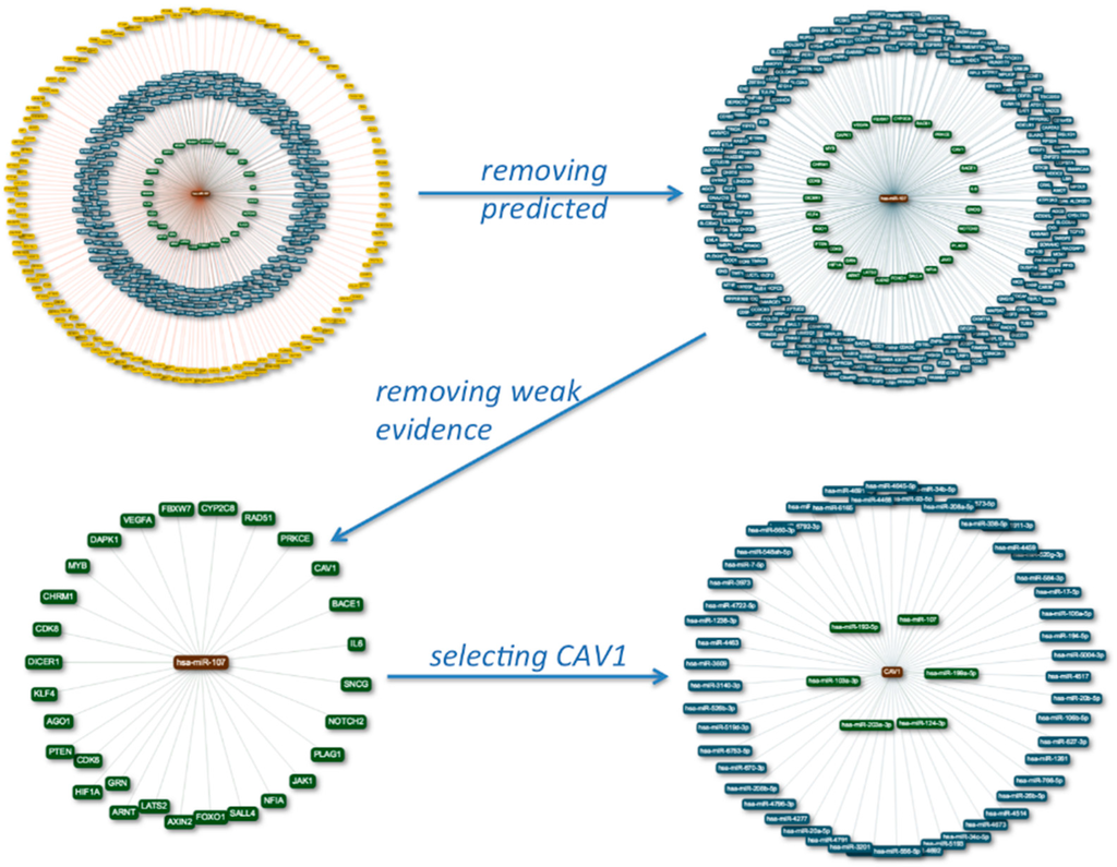 Single miRNA mode for miR-107: The central node is the miRNA, surrounded by validated targets with strong evidence (green), weak evidence (blue), and predicted targets (yellow). In the second representation predicted edges and in the third weak evidence edges are removed. The final representation is gene-centric for one of the target gens of miR-107, CAV1.