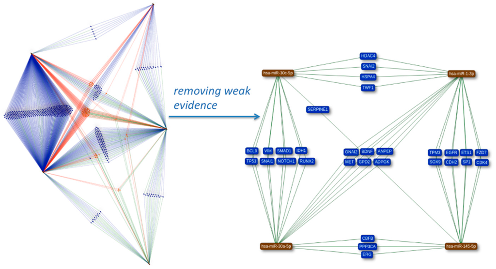 Often, researchers are, however, not only interested in single genes or miRNAs but in sets of the respective molecules. Thus, miRTargetLink can also handle comma-separated lists of identifiers, both for genes and miRNAs. As a case study, we used five known cardio-miRNAs as input, including hsa-miR-1-3p [,], hsa-miR-145-5p [,], hsa-miR-30a-5p [], hsa-miR-30c-5p [], hsa-miR-423-5p []. Users can select the interactions to be included in the network, i.e., weak or strong evidence-validated interactions. The network containing all validated targets for the five cardio miRNAs is presented in Figure 2. The color of the genes indicates the number of interactions. Orange genes are targeted by three or more microRNAs, genes that are targeted by two microRNAs are blue. Interactions with strong experimental evidence are depicted by green edges while interactions with weaker evidence are depicted by blue (genes with two edges) or orange (genes with more than two edges). As for the single gene/miRNA mode, weak evidence edges can be removed. The resulting network for the same miRNAs is presented in the right part of Figure 2. Genes or miRNAs can be marked from this network and novel sub-networks can be generated from the marked nodes in a new window, making the multi-gene/miRNA mode as interactive as the single-gene mode.