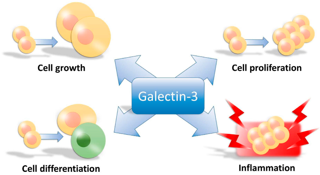 There are several known ligands, including various glycosylated matrix proteins (i.e., laminin, fibronectin, and integrins), for galectin-3 []. Cell adhesion and proliferation due to galectin-3 may translate into pathological processes like fibrosis and cancer progression. In a series of clinical and experimental evidences, galectin-3 has been involved in fibrosis, heart failure, obesity, impaired glucose metabolism, and cancer [,,,,]. Galectin-3 has also been implicated in the pathogenesis of ventricular remodeling, infections, and various autoimmune and inflammatory processes [,]. In acute tissue damage, for instance, it is a key component in the host defense against microbes such as Streptococcus pneumonia []. Therefore, galectin-3 regulates cell growth, proliferation, differentiation, and inflammation (Figure 1).